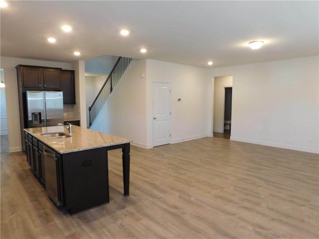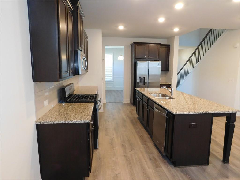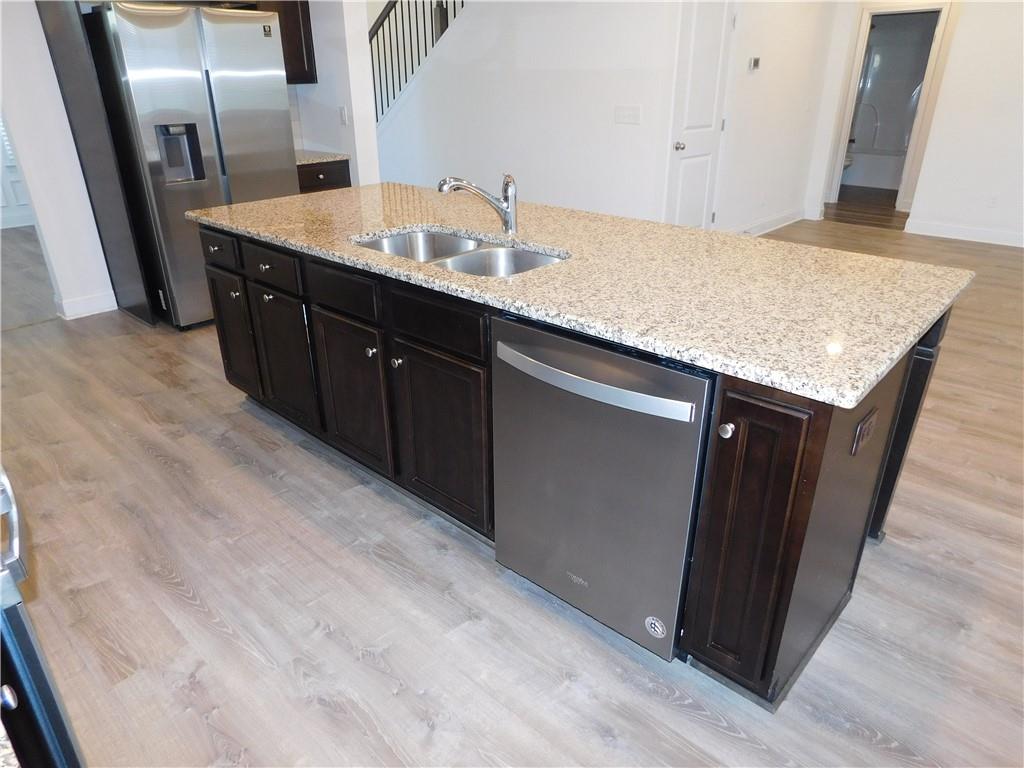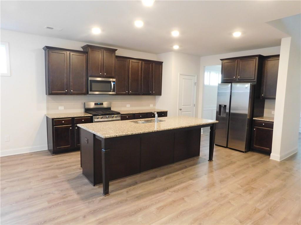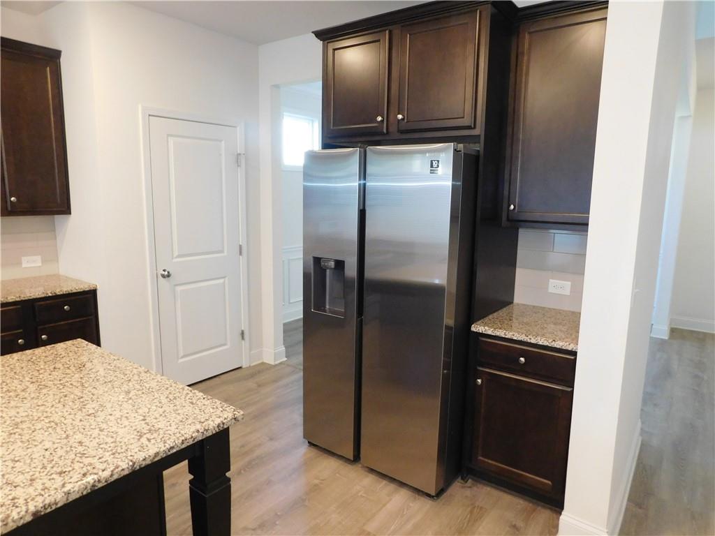 - KitchenBreakfast Bar, Cabinets Stain, Kitchen Island, Pantry Walk-In, Stone Counters, View to Family Room