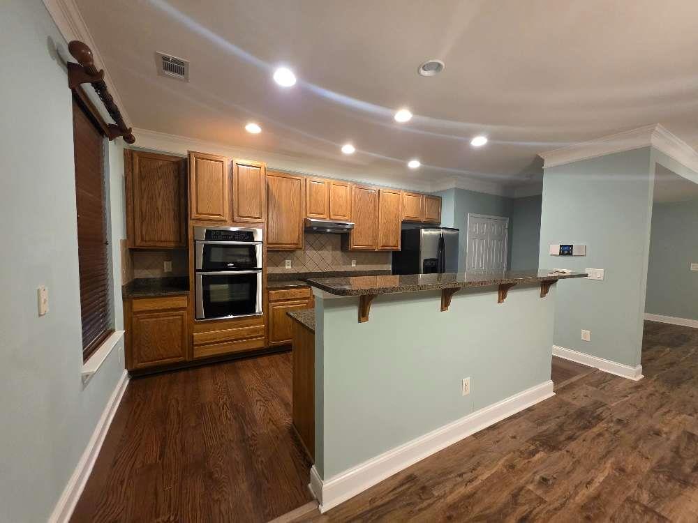 - KitchenBreakfast Bar, Cabinets Stain, Stone Counters, View to Family Room