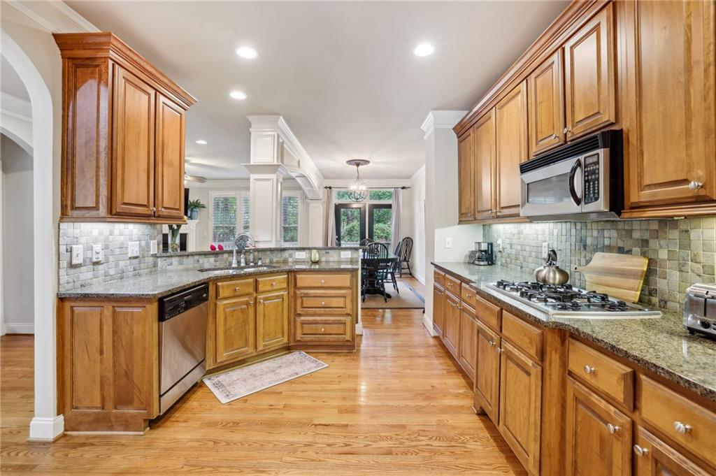 - KitchenCabinets Stain, Eat-in Kitchen, Pantry, Stone Counters, View to Family Room
