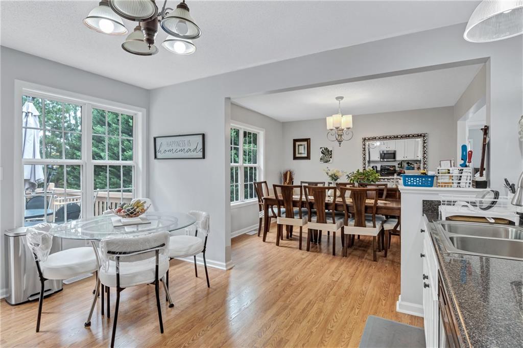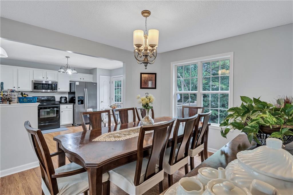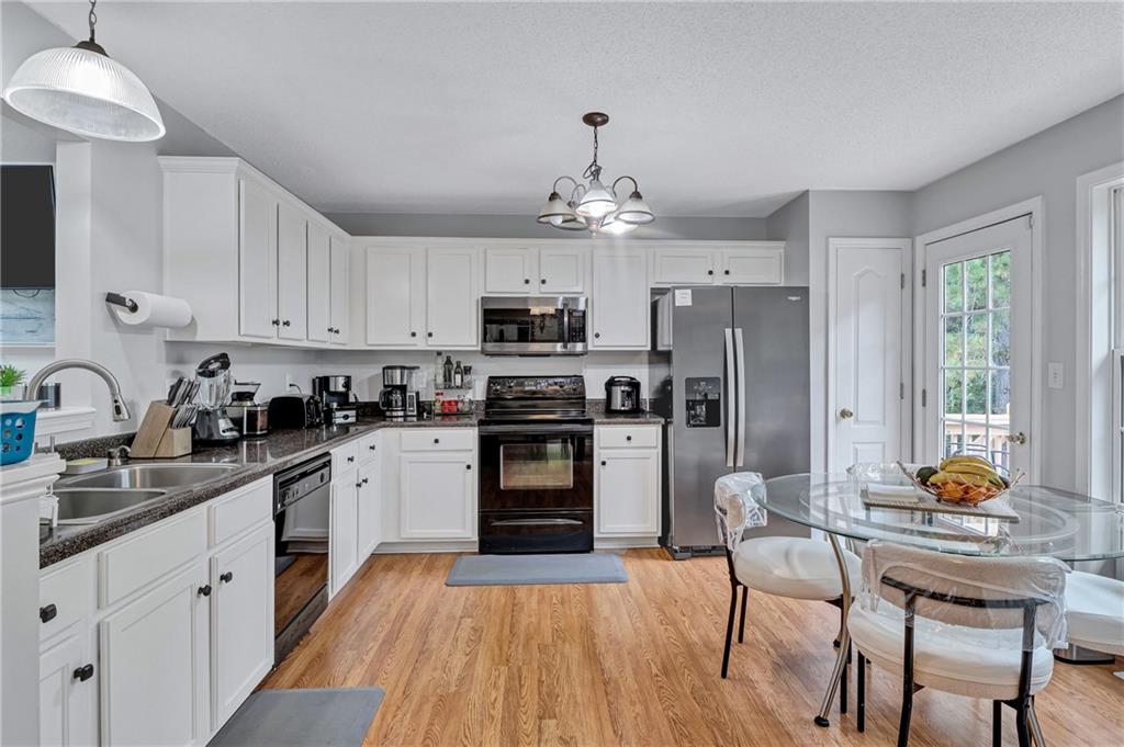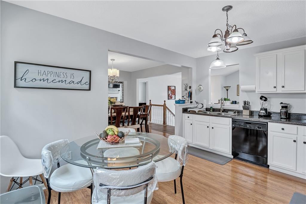 - KitchenCabinets White, Eat-in Kitchen, Laminate Counters, View to Family Room