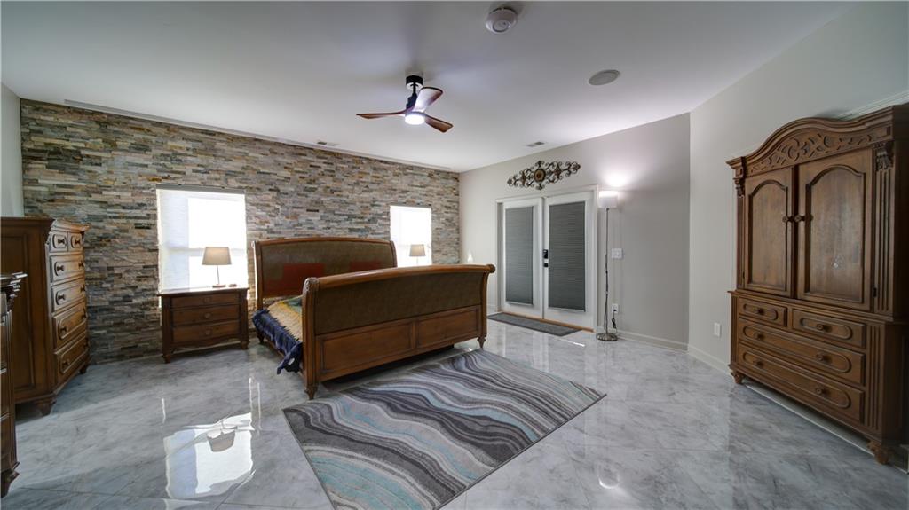 Step inside to discover an open-concept design filled with natural light and large-format flooring. Smart-home lighting and wired access points ensure seamless connectivity. The main-level master suite is a true retreat, featuring double entry doors, a ledger-stone feature wall, heated floors, dual vanities, and separate toilets. Adjoining the suite is a private screened spa room complete with a hot tub and a sitting area. A highlight of the home is the climate-controlled sunroom, designed to feel like a mountain lodge with log siding, a stacked river-rock fireplace, slate floors, and a power skylight. Quad French doors open to a beautifully landscaped backyard with a spacious patio and tranquil water feature, creating the ultimate indoor-outdoor living experience. Upstairs, enjoy a custom home theater & recreation room with luxury built-ins. Perfect for movie nights, gaming, or a fitness studio. Practicality meets design with a large laundry room featuring multiple clothes racks, cabinetry, a utility sink, and two lockable storage cabinets. The epoxy-finished garage offers 12-foot ceilings, overhead racks, under-stair storage, and a professional-grade shop area with metal cabinets. Outside, the stunning landscaping frames a serene backyard retreat complete with a fenced dog park. With six spacious bedrooms, a master on main, and resort-style amenities throughout, this home effortlessly combines luxury, technology, and everyday comfort. Whether hosting guests, relaxing by the fire, or enjoying movie night with family, this home truly has it all.