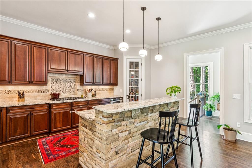 - KitchenBreakfast Bar, Cabinets Stain, Kitchen Island, Stone Counters, Wine Rack