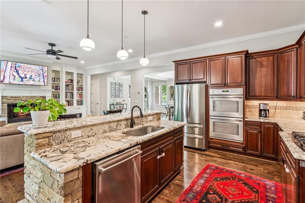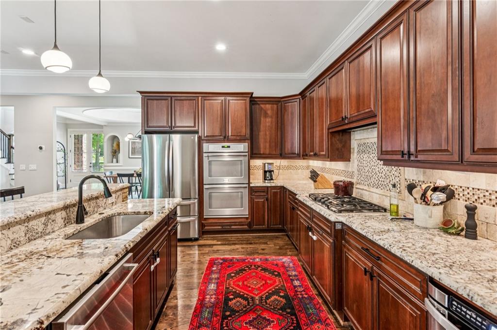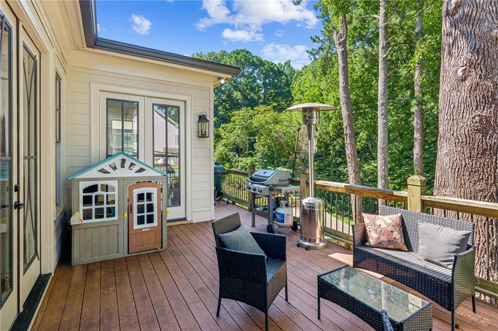 This beautiful Woodland Hills home offers the perfect blend of luxury, comfort, and functionality. Bright and open, the floor plan is designed for effortless everyday living as well as easy entertaining. The gourmet kitchen features high-end stainless-steel appliances, including a gas range, double oven, refrigerator, and pantry, along with generous cabinet and counter space. It opens seamlessly to the great room and a spacious deck overlooking the private backyard, ideal for gatherings or quiet evenings at home. The large dining room flows from the kitchen and includes a built-in wine cellar ready for your favorite collection. The primary suite is conveniently located on the main level, providing both comfort and privacy. Upstairs, a wide hallway lined with custom built-in bookcases creates a charming library nook, leading to three additional bedrooms, two with en-suite baths. Thoughtful storage solutions throughout the home keep everything organized and within easy reach. The terrace level offers its own private entrance and includes a bedroom, full bath, family or media room, extra storage, and a second deck with serene backyard views, perfect for guests, teens, or multi-generational living. Additional highlights include a tankless water heater, washer and dryer, and professional landscaping. Ideally located in the desirable Woodland Hills neighborhood, this home offers easy access to top-rated schools, shopping, dining, parks, and more. With four bedrooms, four and a half baths, and a spacious layout, this home offers the space, style, and convenience to live beautifully.