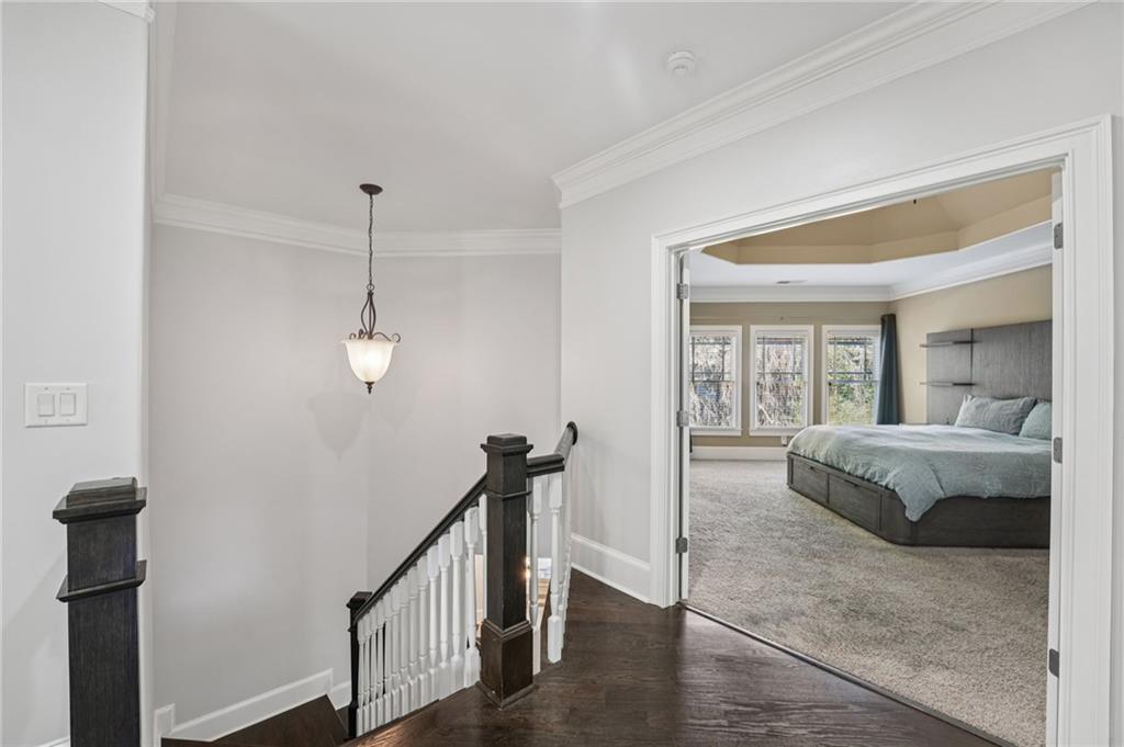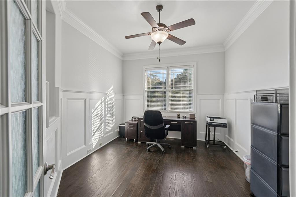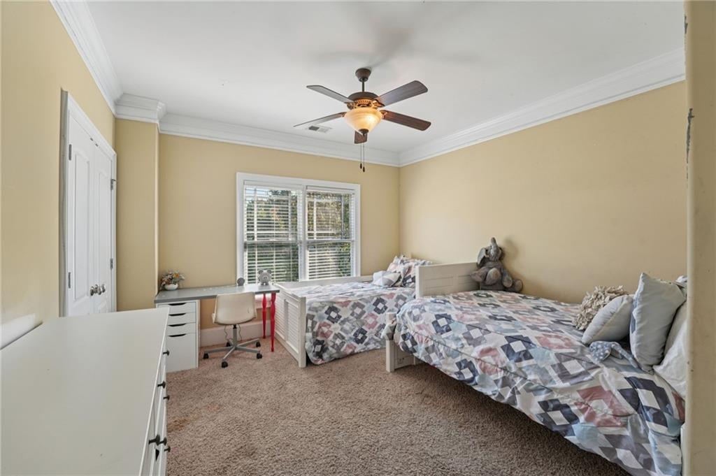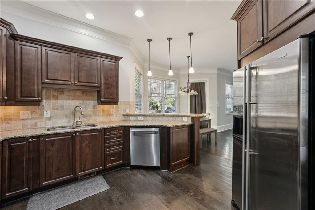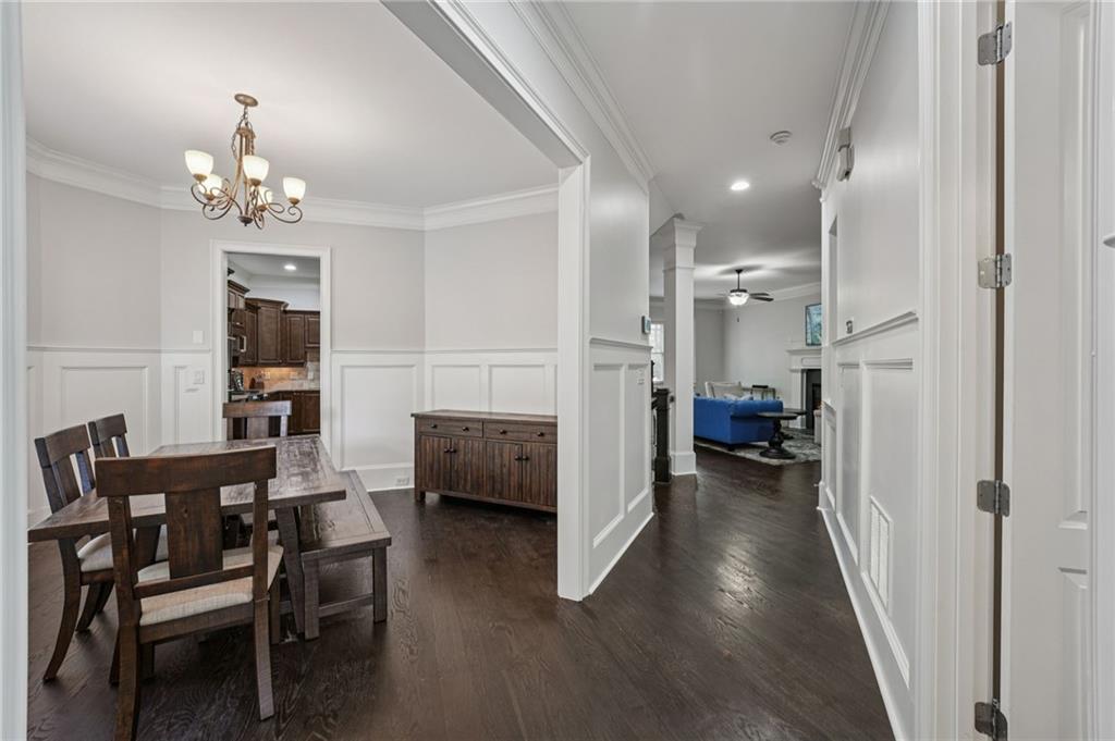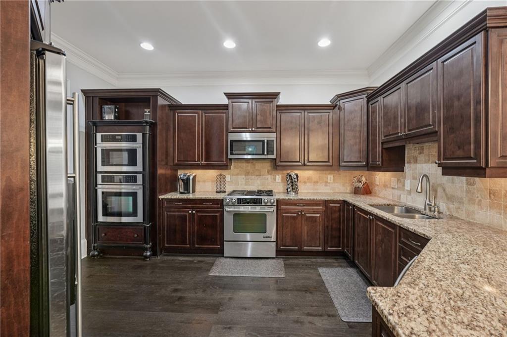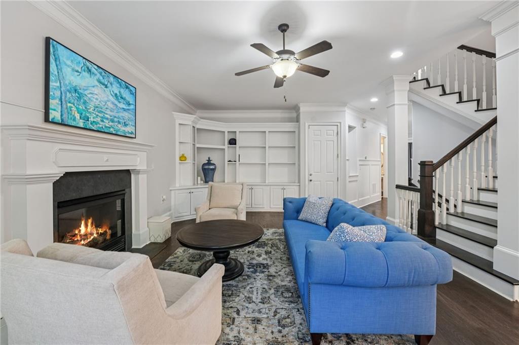 Lovely home with bright open spaces! An inviting front porch welcomes you inside to gorgeous hardwood floors throughout the main living areas. A bright office to the right, and a formal dining room with crown molding to the left. The spacious living room is filled with natural light and features built-ins and a cozy fireplace, flowing seamlessly into the informal dining area with private backyard views. The kitchen is perfect for entertaining, featuring a breakfast bar, granite countertops, stainless steel appliances including a double oven, and a stylish tile backsplash. A convenient half bath completes the main level. Upstairs, retreat to the oversized primary suite with a tray ceiling, spa-like bath with dual granite vanities, a pedestal soaking tub, and a fully tiled walk-in shower. A huge walk-in closet provides plenty of storage. Three spacious secondary bedrooms include a Jack-and-Jill bath shared by two, plus a private en-suite in the third. The upstairs laundry room adds everyday convenience. The finished basement with new carpet offers a large gathering area—perfect for a media room, man cave, craft space, or playroom—plus a bedroom, full bath, and a wet bar ready for movie nights. Unfinished spaces offer additional possibilities. Fantastic location just a stone’s throw from the Lynwood Recreation Center with pool, tennis, soccer fields, playground, parks, gazebo, and more, while also just minutes to Downtown, Truist Park, and major conveniences. Book your tour today!