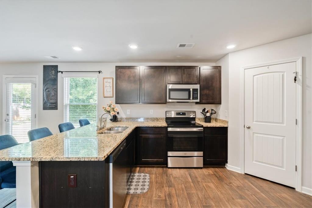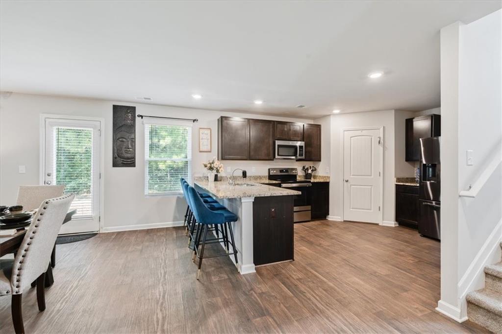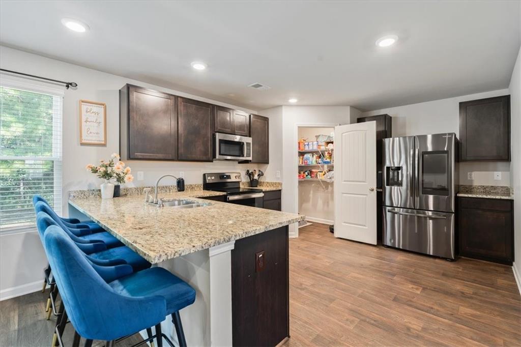 - KitchenBreakfast Bar, Breakfast Room, Cabinets Stain, Eat-in Kitchen, Kitchen Island, Pantry, Pantry Walk-In, Stone Counters, View to Family Room