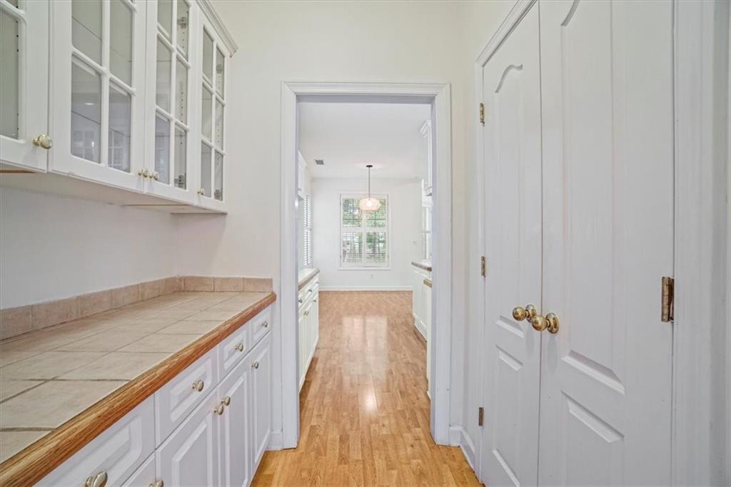 - KitchenBreakfast Bar, Cabinets White, Eat-in Kitchen, Pantry, Tile Counters, View to Family Room