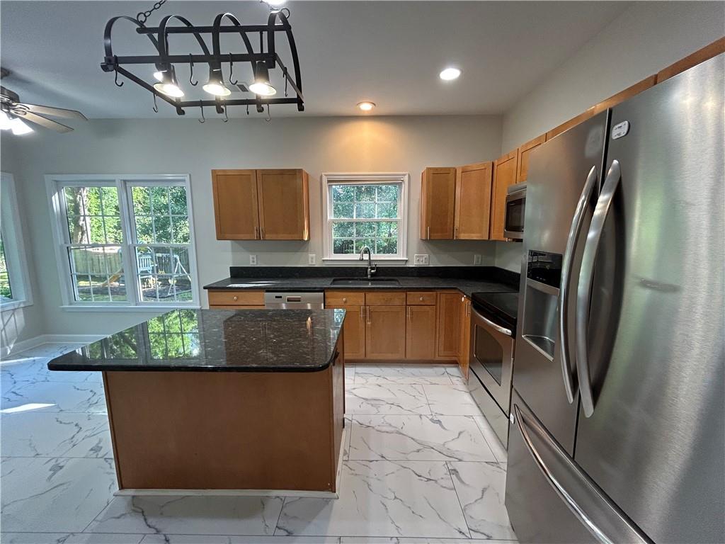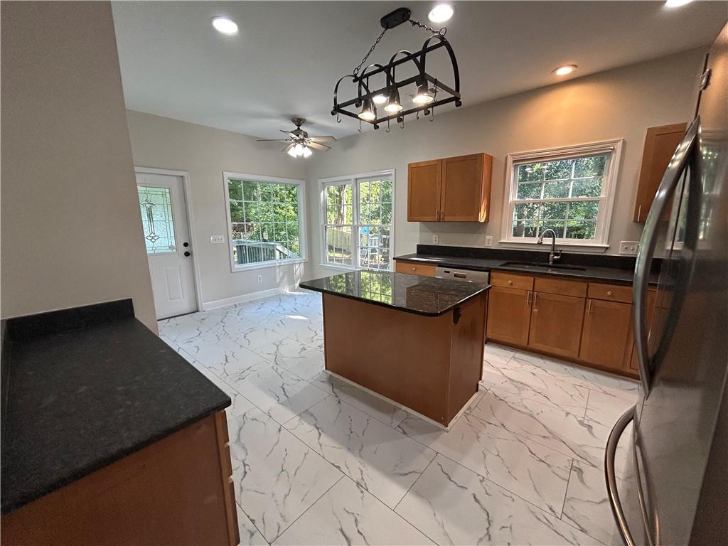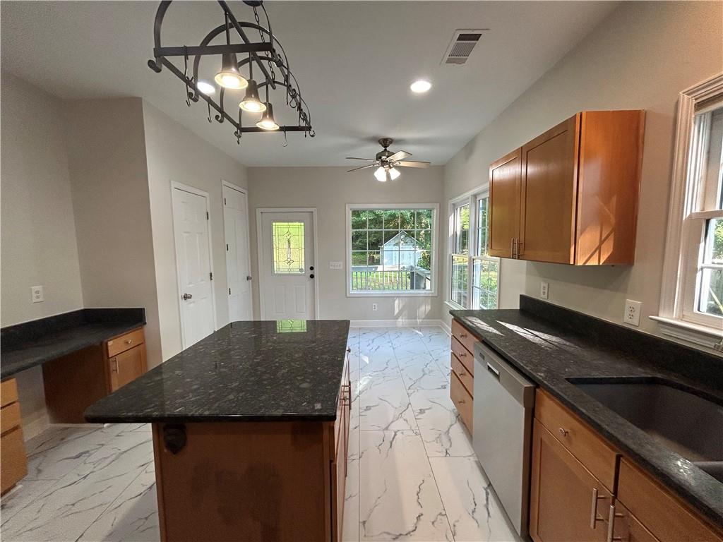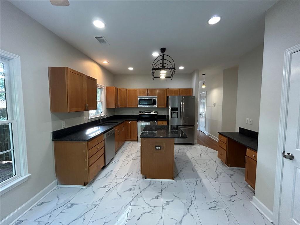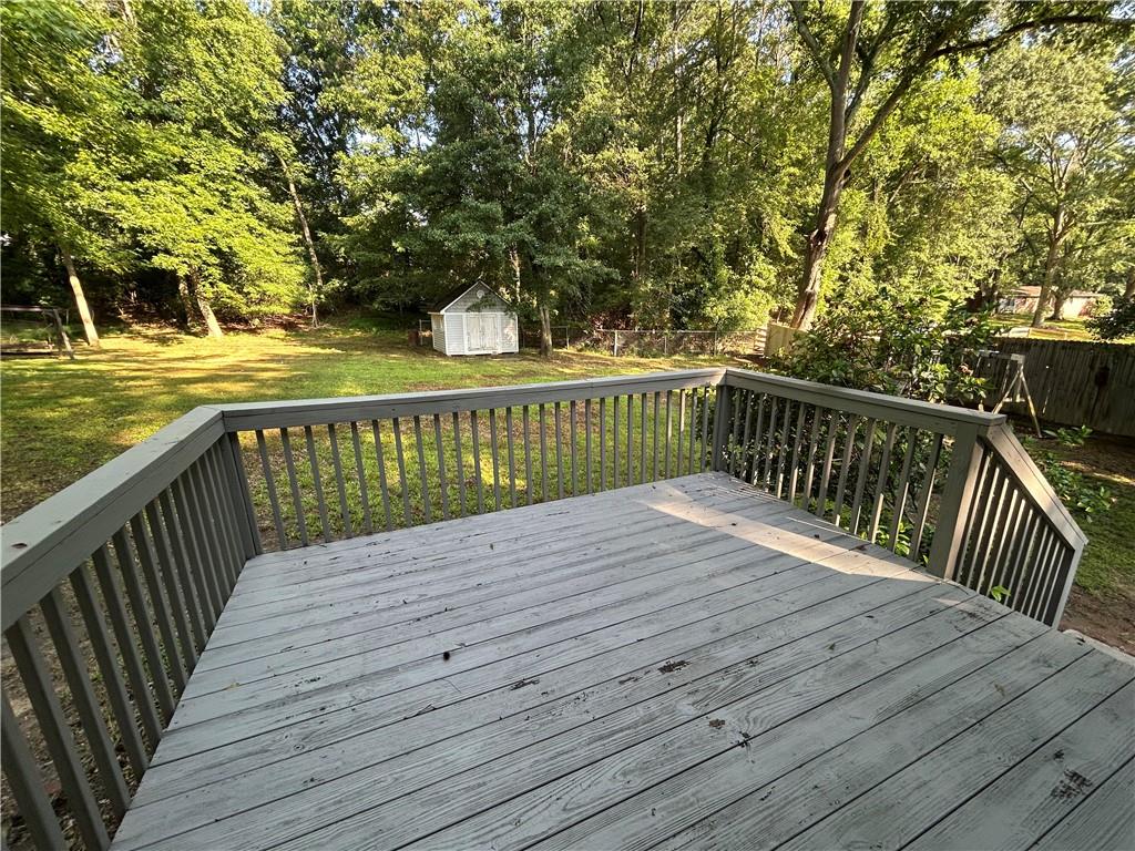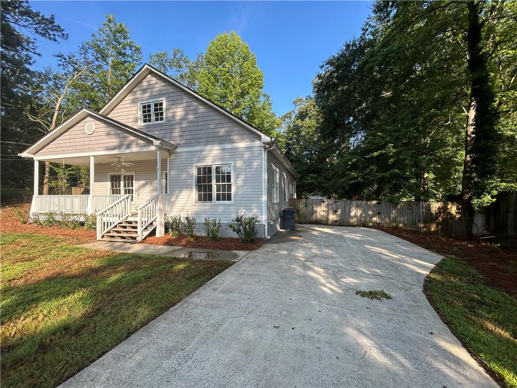 Welcome to this Charming Bungalow! Located on a HUGE lot of 0.86 acres with close proximity to the picturesque historic Acworth! HARDWOOD flooring on the main floor and in the MASTER suite upstairs! Plenty of space for storage if needed! All NEW luxury vinyl marble tile in the kitchen as well as all bathrooms and laundry room! Updated kitchen includes GRANITE counter tops, STAINLESS STEEL appliances, island, and desk area. NEW FLOORING in all ground floor bedrooms! Fresh NEW INTERIOR paint throughout entire home and NEW EXTERIOR paint on the backyard deck! With another MASTER suite on the GROUND floor and 2 additional bedrooms, the home also features 2 more FULL baths. Huge PRIVATE level backyard with separate storage building. Completed encapsulation of crawlspace Oct 2025. LIFETIME warranty on the encapsulation with 5 year warranty on the 2 NEW sump pumps and NEW dehumidifier. Take a walk and enjoy the friendly and serene atmosphere of the surrounding neighborhood. Relax on front porch, hang out on your backyard deck, enjoy the convenience of close-by shopping, or appreciate an active lifestyle on the lake! NO HOA; therefore, NO rental restrictions! Sold As-Is.