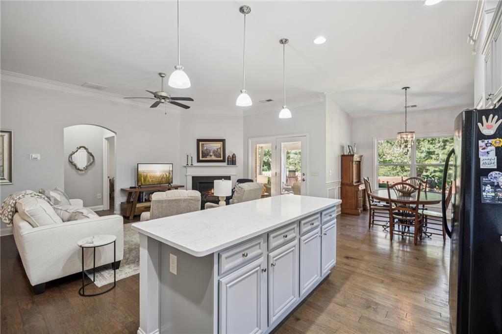 - KitchenBreakfast Room, Cabinets Other, Cabinets White, Kitchen Island, Pantry, Stone Counters, View to Family Room