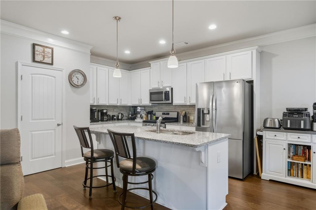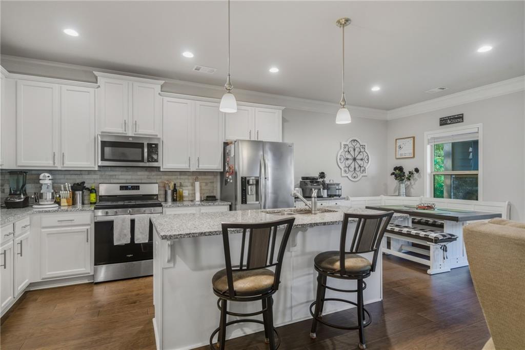 - KitchenCabinets White, Eat-in Kitchen, Kitchen Island, Solid Surface Counters, View to Family Room