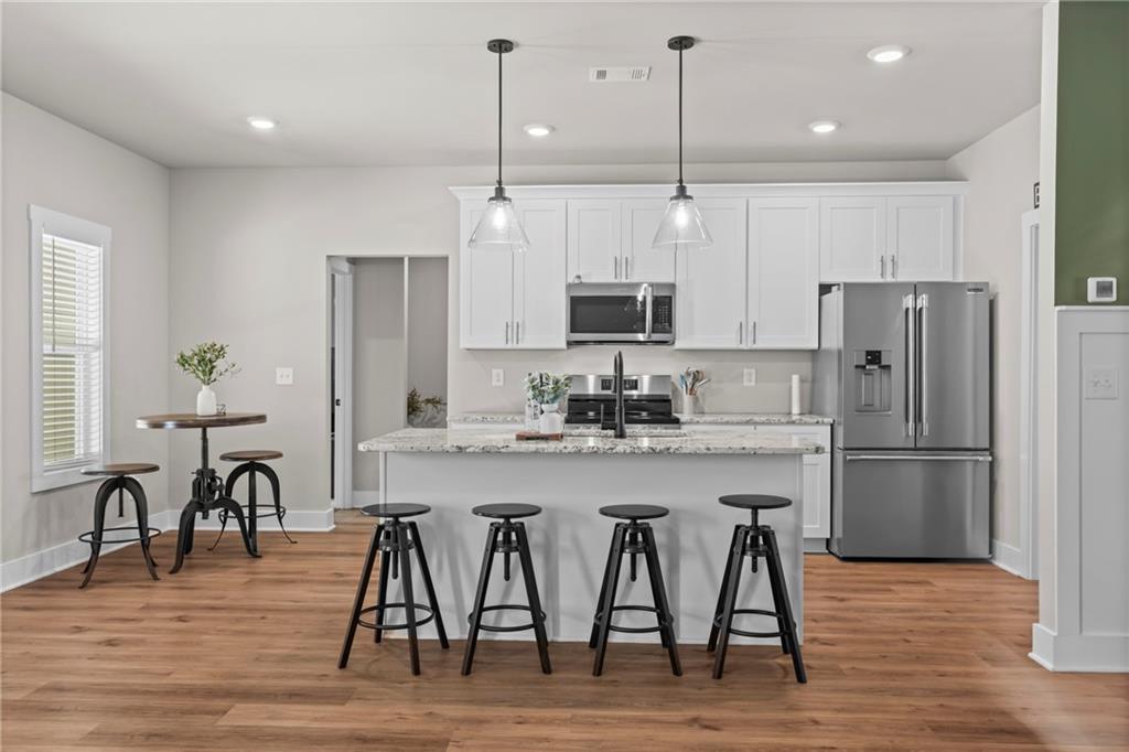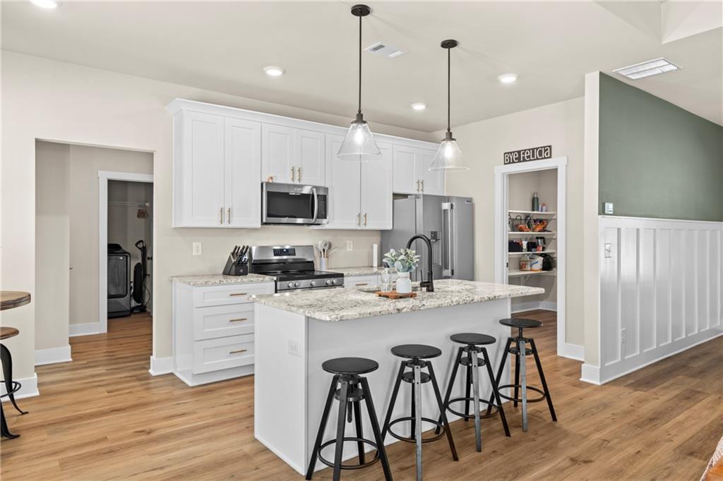 - KitchenBreakfast Room, Cabinets White, Eat-in Kitchen, Kitchen Island, Pantry, Pantry Walk-In, Solid Surface Counters, View to Family Room