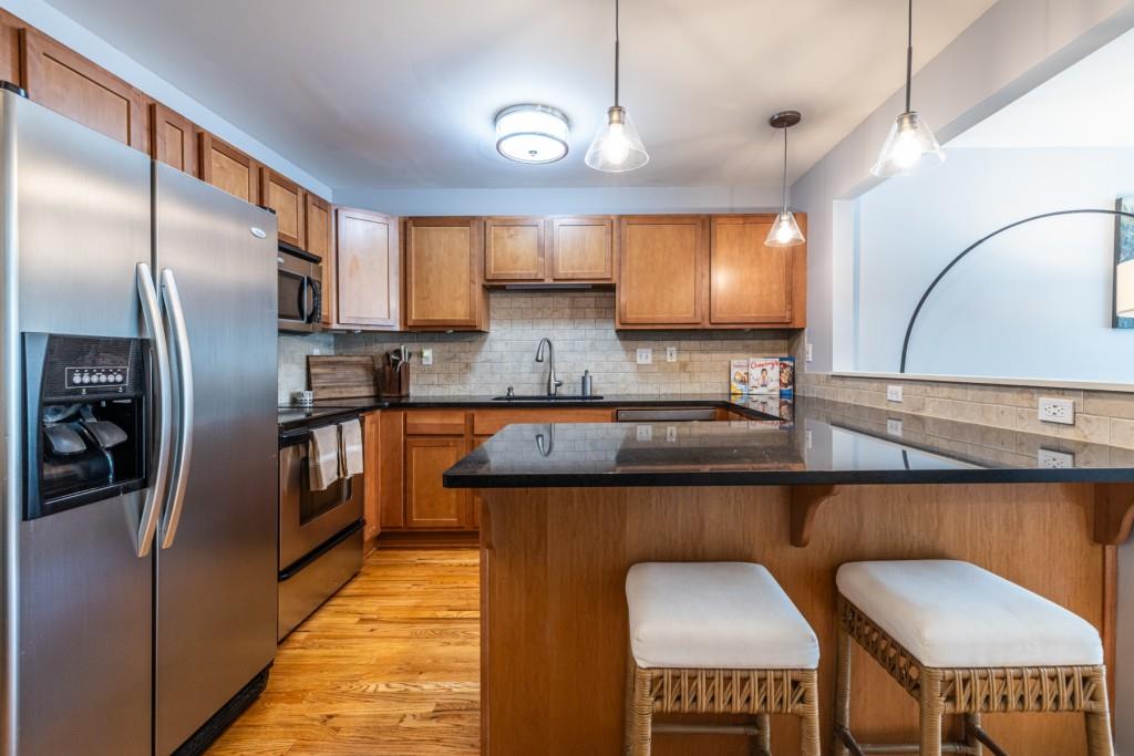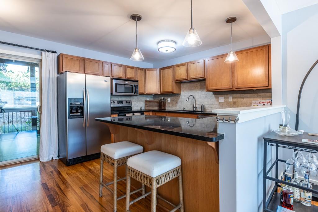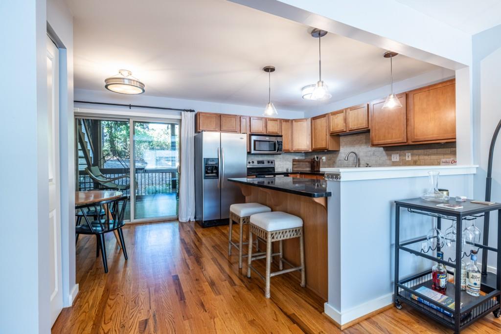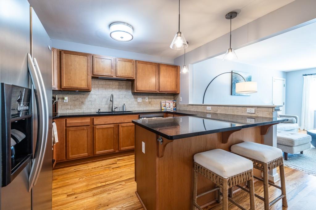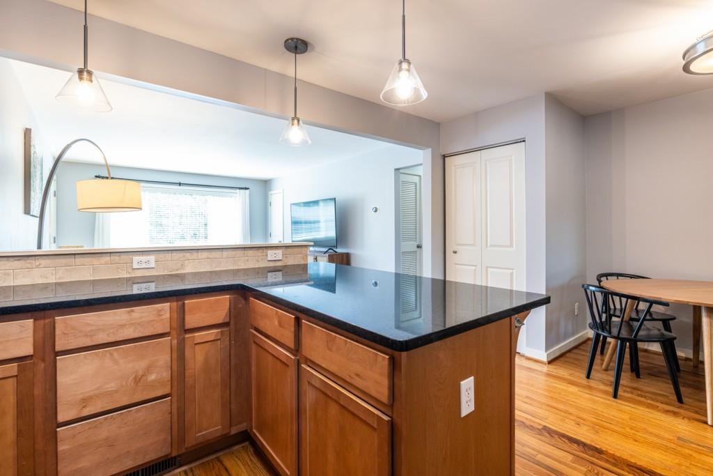 - KitchenBreakfast Bar, Cabinets Stain, Stone Counters, View to Family Room