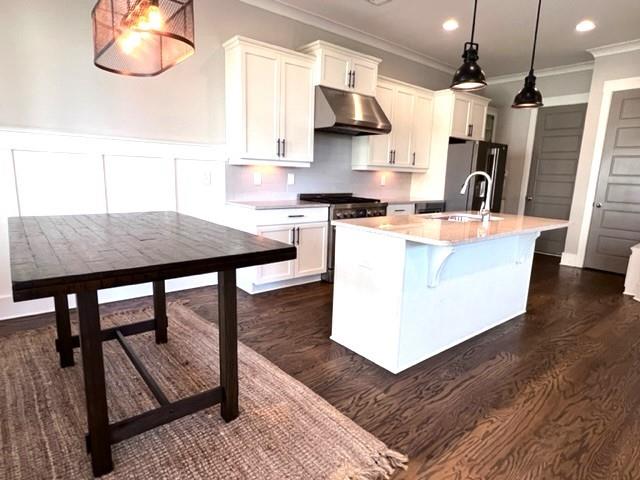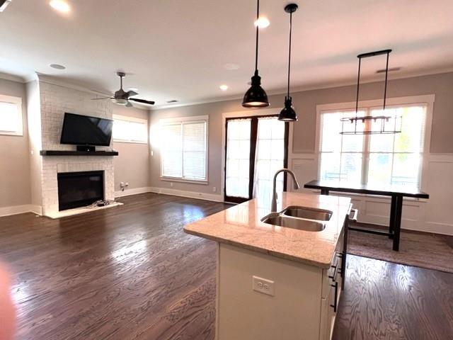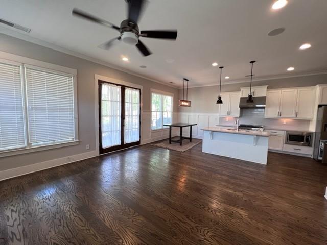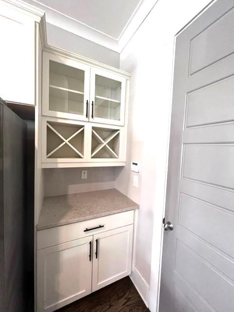 - KitchenBreakfast Bar, Cabinets White, Eat-in Kitchen, Kitchen Island, Pantry, Stone Counters, View to Family Room