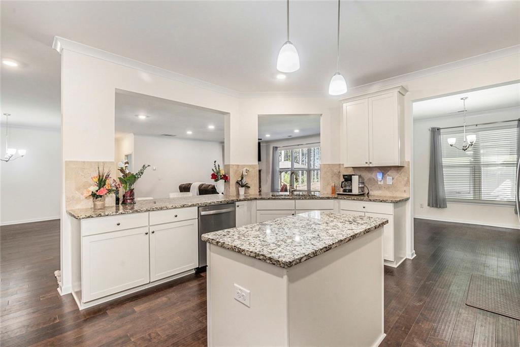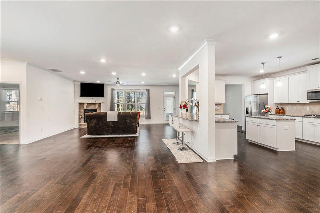 - KitchenBreakfast Bar, Cabinets White, Kitchen Island, Pantry, Pantry Walk-In, Stone Counters