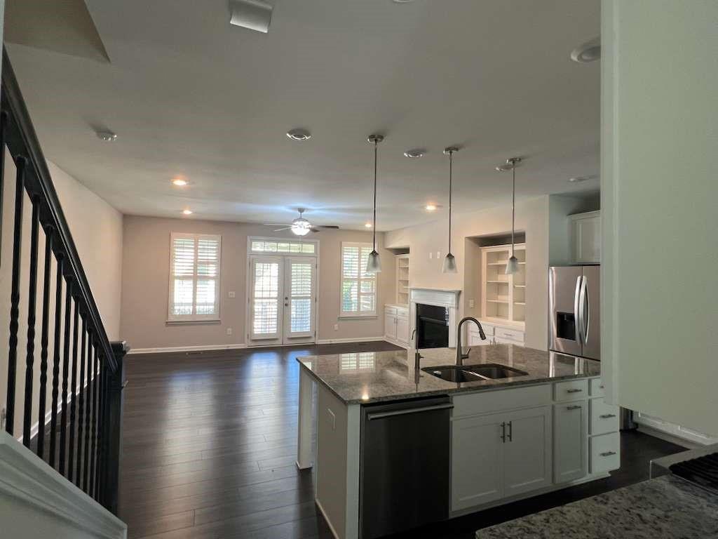 4 bedrooms 3.5 Bath rooms AVAILABLE FOR RENT! LOCATION! LOCATION! LOCATION! Just 2 miles from GA-400. Great School district New Hope Elementary, DeSana Middle, and Denmark High schools. Close to shopping, entertainment, Vickery Village, Halcyon and Collection. Amenities include Olympic-sized pool, splash pad, clubhouse, fitness center, tennis, outdoor fireplace area, playground, pond, park, walking trails, and access to the Big Creek Greenway. Close to Atlanta-area employers such as Hewlett Packard, AT&T, Verizon, Siemens and many others. Home Offering a well-designed, open concept floor plan, and neutral paint throughout, this immaculate home! The functional and stylish kitchen features a huge island, granite countertops, abundant cabinet space, spacious pantry and beautiful stainless-steel appliances. The kitchen flows seamlessly into the inviting family room, complete with a gas log fireplace. The main level features beautiful luxury vinyl plank floors - durable and easy to clean! Guests will enjoy the convenient bedroom, with a spacious closet and adjoining bathroom. Retreat to the elegant upper-level primary suite, featuring two large closets, and a luxurious ensuite bathroom with double sinks, a soaker tub and separate tiled shower.