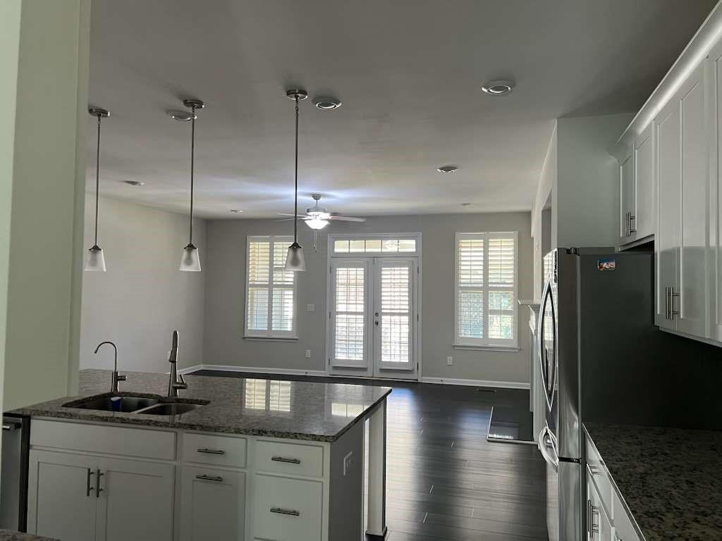 - KitchenCabinets White, Kitchen Island, Pantry, Stone Counters, View to Family Room