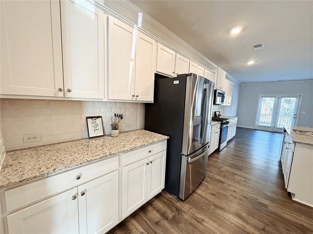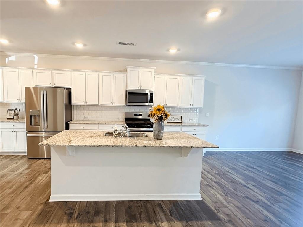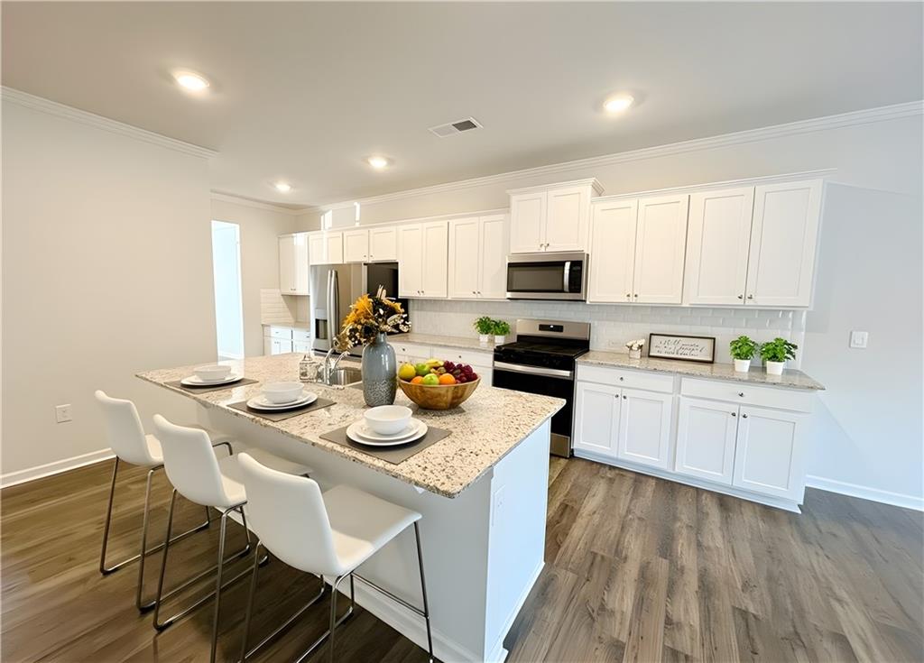 - KitchenBreakfast Bar, Cabinets White, Eat-in Kitchen, Kitchen Island, Pantry Walk-In, Solid Surface Counters, View to Family Room