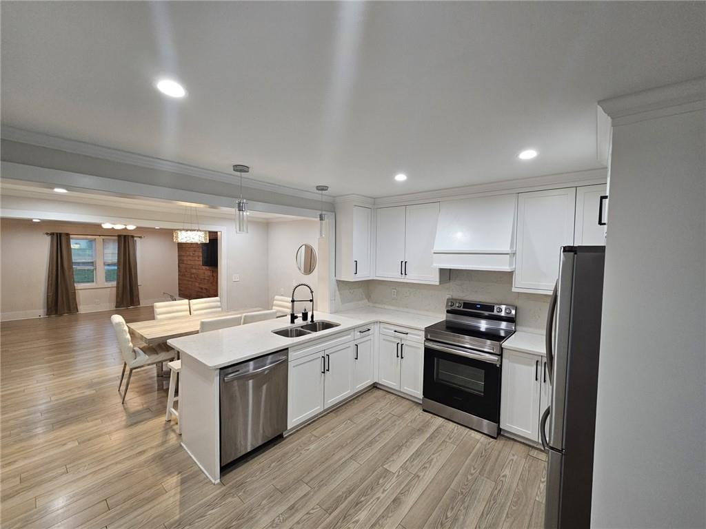 - KitchenBreakfast Bar, Breakfast Room, Cabinets White, Eat-in Kitchen, Kitchen Island, Stone Counters, View to Family Room