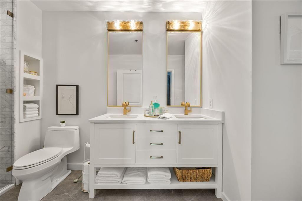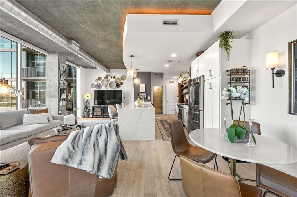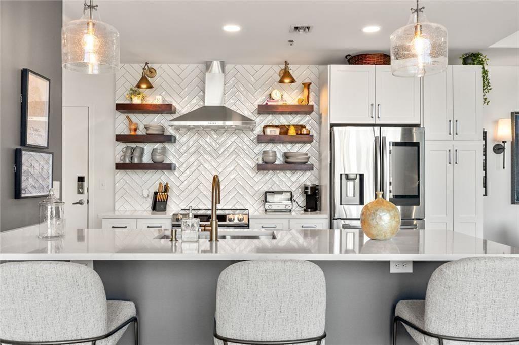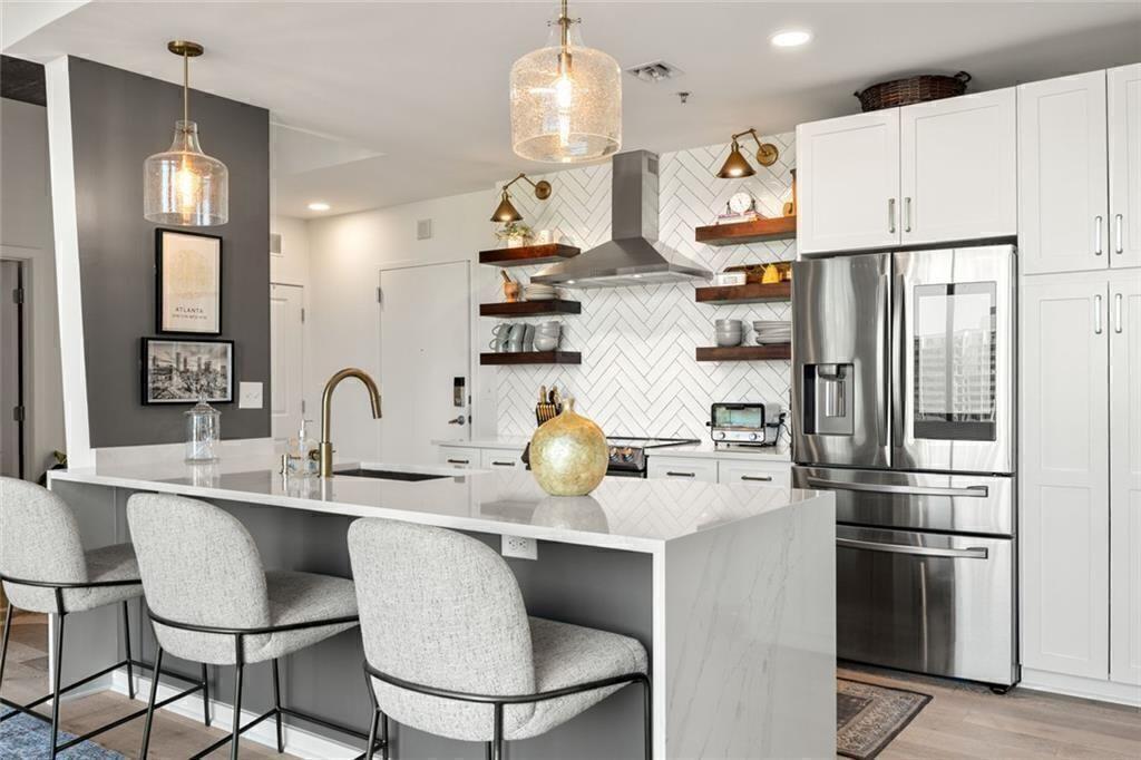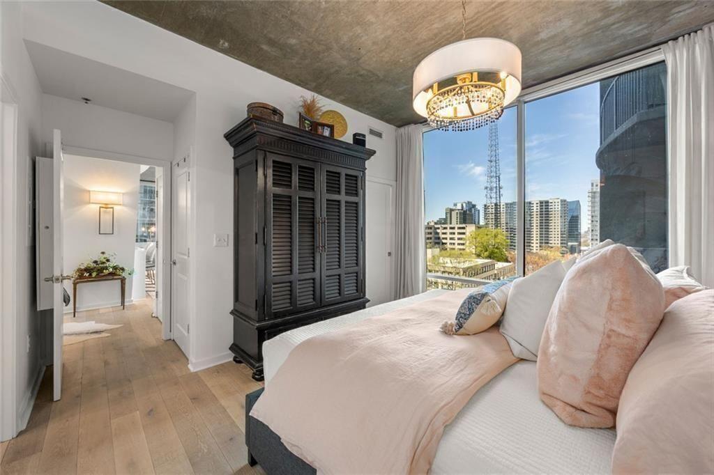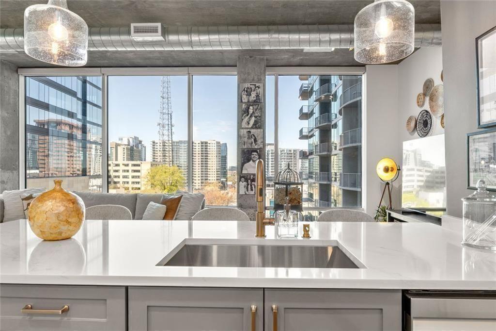 A rare designer residence in the heart of Midtown’s skyline. Step into one of Metropolis’ most coveted one-bedroom corner homes—an impeccably upgraded space with bespoke finishes, dramatic skyline views, and a rare storage unit. Every surface has been thoughtfully reimagined with a designer’s eye for detail, creating a level of sophistication rarely found in high-rise living. Walls of floor-to-ceiling windows flood the space with natural light, framing Atlanta’s iconic skyline. The open-concept kitchen is a showpiece, featuring white shaker cabinetry, a waterfall-edge quartz island, chevron-patterned backsplash, floating wood shelves, and premium stainless steel appliances. The spa-quality bath offers a frameless glass shower, dual vanity, hex marble tile, and chic gold fixtures, while the bedroom feels like a private retreat with custom drapery, motorized shades, and a spacious walk-in closet. Throughout, wide-plank hardwood floors, curated lighting, and sophisticated textures elevate every detail. Metropolis is Midtown’s premier address, offering a 24-hour concierge, saltwater pool with cabanas, state-of-the-art fitness center, stylish clubroom, multiple outdoor kitchens and firepits, EV charging stations, and a skyline observation deck. Perfectly located at Peachtree and 8th with a Walk Score of 93, you’re steps from Piedmont Park, Colony Square, The Fox Theatre, and Atlanta’s best dining and shopping. Minutes to Buckhead, Ponce City Market, and major highways—this is luxury city living, redefined.