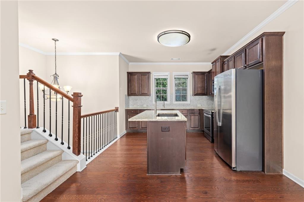 - KitchenBreakfast Bar, Cabinets Stain, Eat-in Kitchen, Kitchen Island, Pantry, Stone Counters, View to Family Room