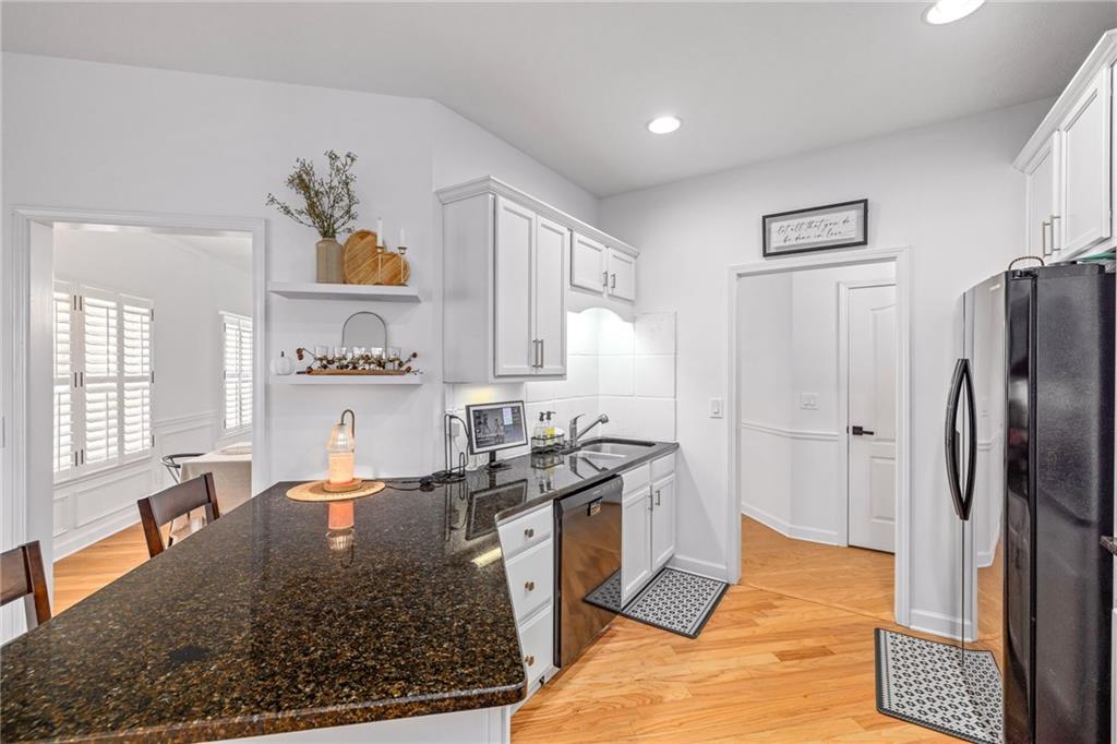 - KitchenCabinets White, Pantry Walk-In, Stone Counters, View to Family Room