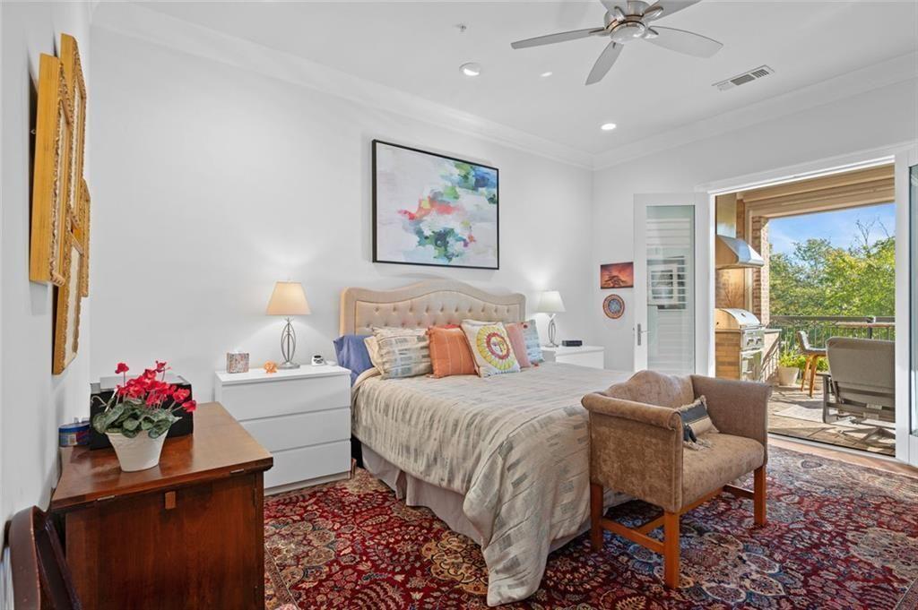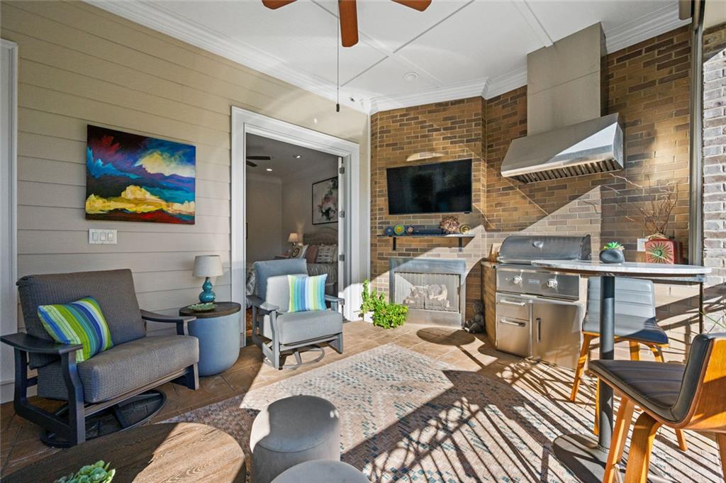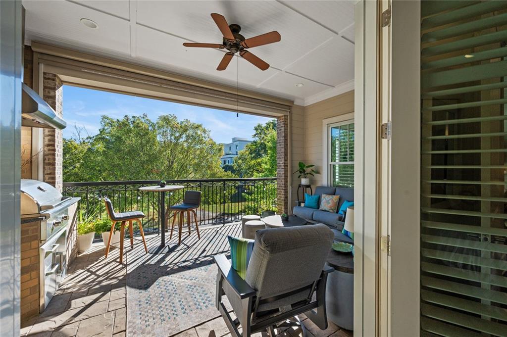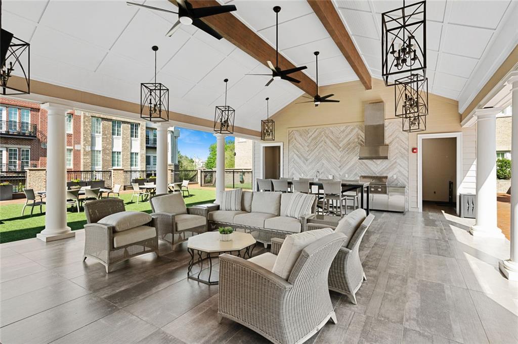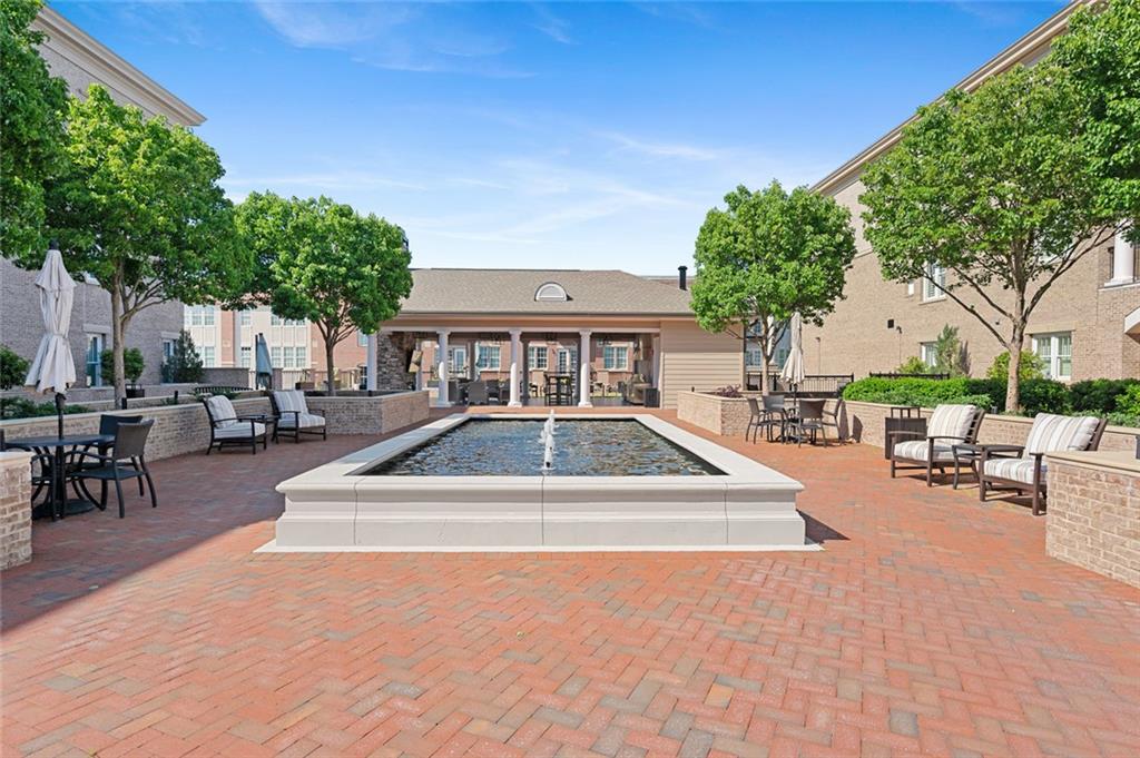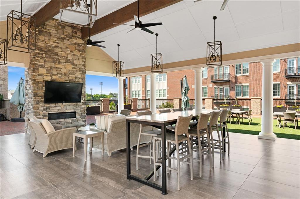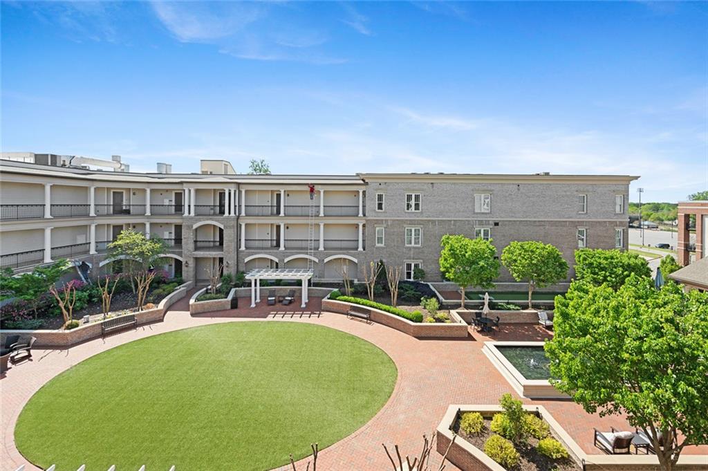Experience LUXURY ONE LEVEL LIVING in the heart of downtown Alpharetta!! Enjoy walking to shops, restaurants, farmers market and year round events. As you enter this beautiful Unit you will find an open concept with a tons of natural sunlight. The chefs kitchen boast of quartz countertops and high end appliances such as a Wolf gas range and Sub-Zero refrigerator. Off the kitchen you will find an oversize walk in pantry. The open-concept living and dining area flows seamlessly to a private balcony complete with a built in grill, cozy fireplace and an electric screen you can let down to block sun, have privacy, while also making it enjoyable all year round. Perfect for relaxing. The beautiful primary bedroom also walks out to the private balcony. You will find beautiful hardwoods throughout the unit. The primary has its own spa like bath and large walk in California type closet. The secondary bedroom is equipped with its own private bath for privacy. This Unit is perfectly located on the second level which opens up to the beautiful park and amenities. The park includes a relaxing fountain, beautiful pavilion with fireplace, tv, and outdoor kitchen, perfect for hosting get togethers. The park also includes a green egg, bocci ball court, fire pit, herb garden, and dog park. Teasley place also has a fully equipped gym, and a gated, secure, parking garage with 2 designated parking spaces. This unit parking spots come with an EV charger, and your own climate control storage unit. Teasley Place is a one of a kind in Alpharetta and you will love this resort style living. The HOA includes Premium tv package with all channels, 50 Hours of cloud DVR storage, high speed internet, trash, and concierge.