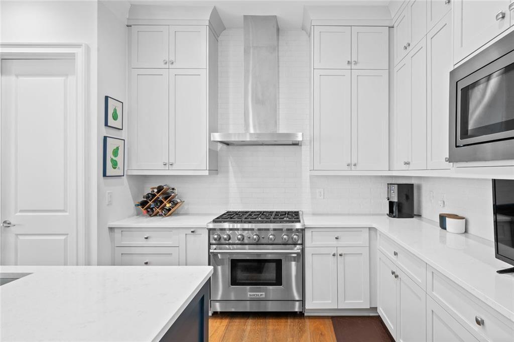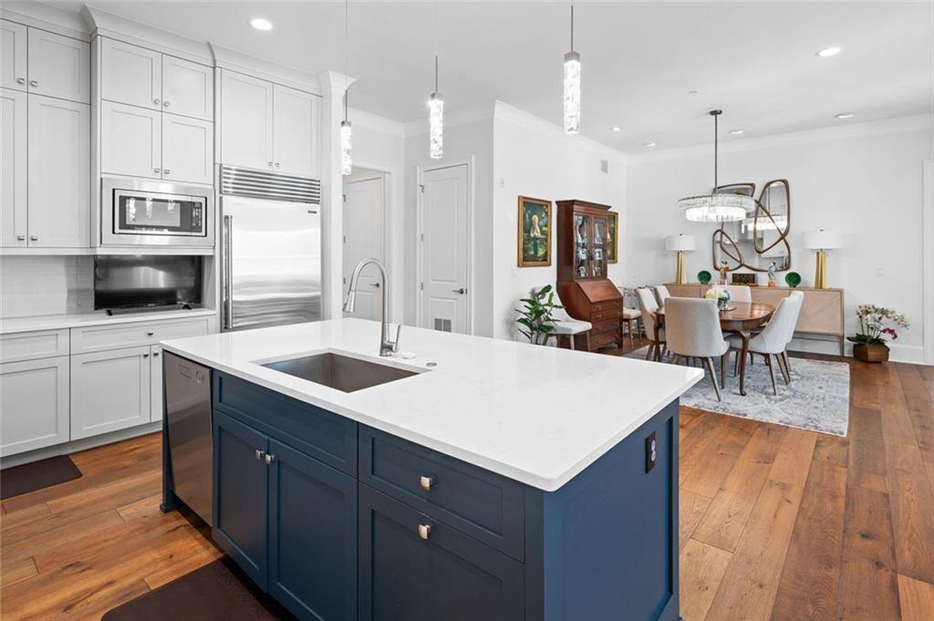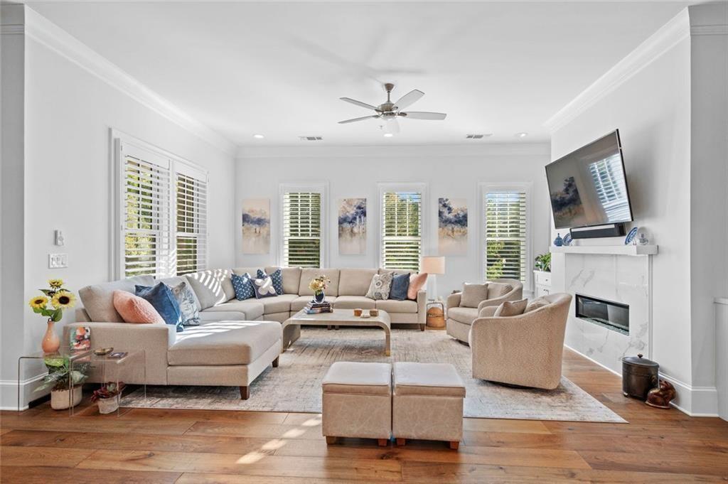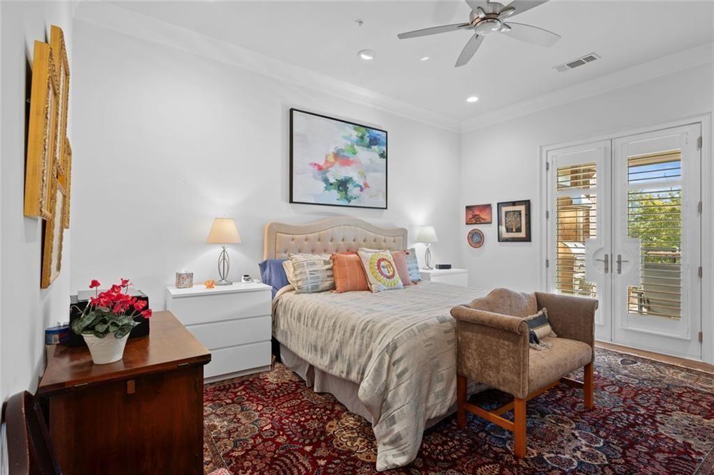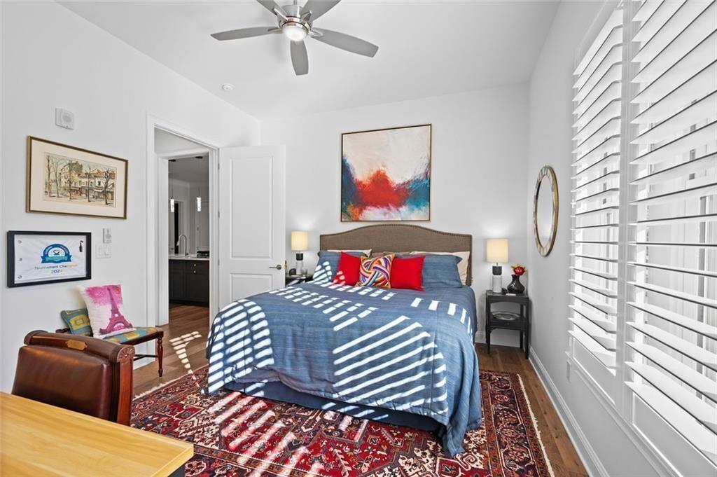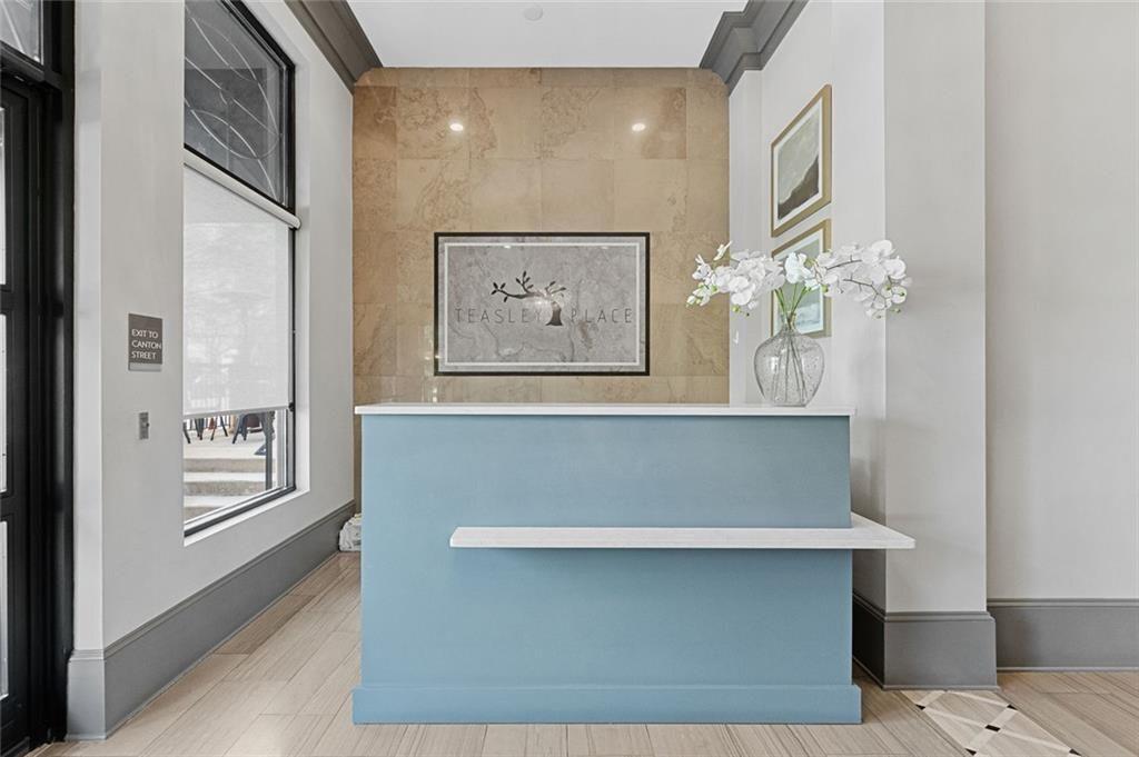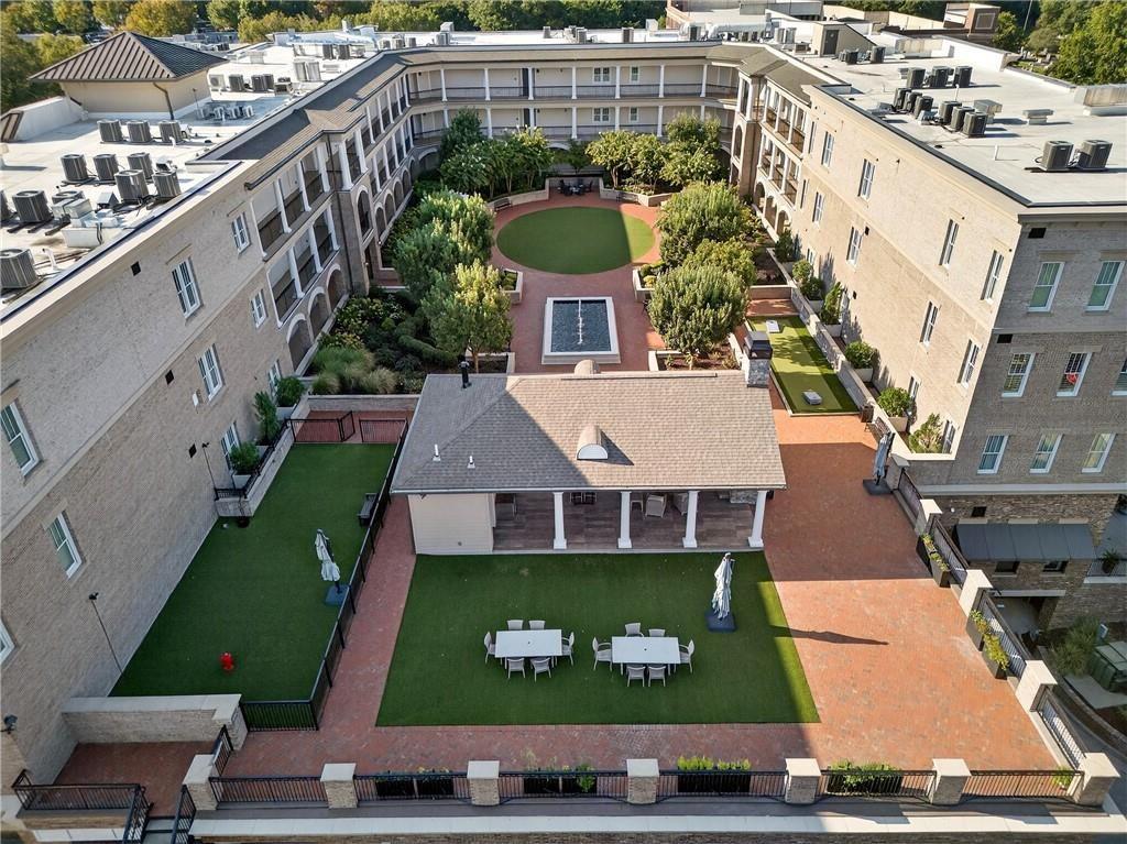Experience LUXURY ONE LEVEL LIVING in the heart of downtown Alpharetta!! Enjoy walking to shops, restaurants, farmers market and year round events. As you enter this beautiful Unit you will find an open concept with a tons of natural sunlight. The chefs kitchen boast of quartz countertops and high end appliances such as a Wolf gas range and Sub-Zero refrigerator. Off the kitchen you will find an oversize walk in pantry. The open-concept living and dining area flows seamlessly to a private balcony complete with a built in grill, cozy fireplace and an electric screen you can let down to block sun, have privacy, while also making it enjoyable all year round. Perfect for relaxing. The beautiful primary bedroom also walks out to the private balcony. You will find beautiful hardwoods throughout the unit. The primary has its own spa like bath and large walk in California type closet. The secondary bedroom is equipped with its own private bath for privacy. This Unit is perfectly located on the second level which opens up to the beautiful park and amenities. The park includes a relaxing fountain, beautiful pavilion with fireplace, tv, and outdoor kitchen, perfect for hosting get togethers. The park also includes a green egg, bocci ball court, fire pit, herb garden, and dog park. Teasley place also has a fully equipped gym, and a gated, secure, parking garage with 2 designated parking spaces. This unit parking spots come with an EV charger, and your own climate control storage unit. Teasley Place is a one of a kind in Alpharetta and you will love this resort style living. The HOA includes Premium tv package with all channels, 50 Hours of cloud DVR storage, high speed internet, trash, and concierge.