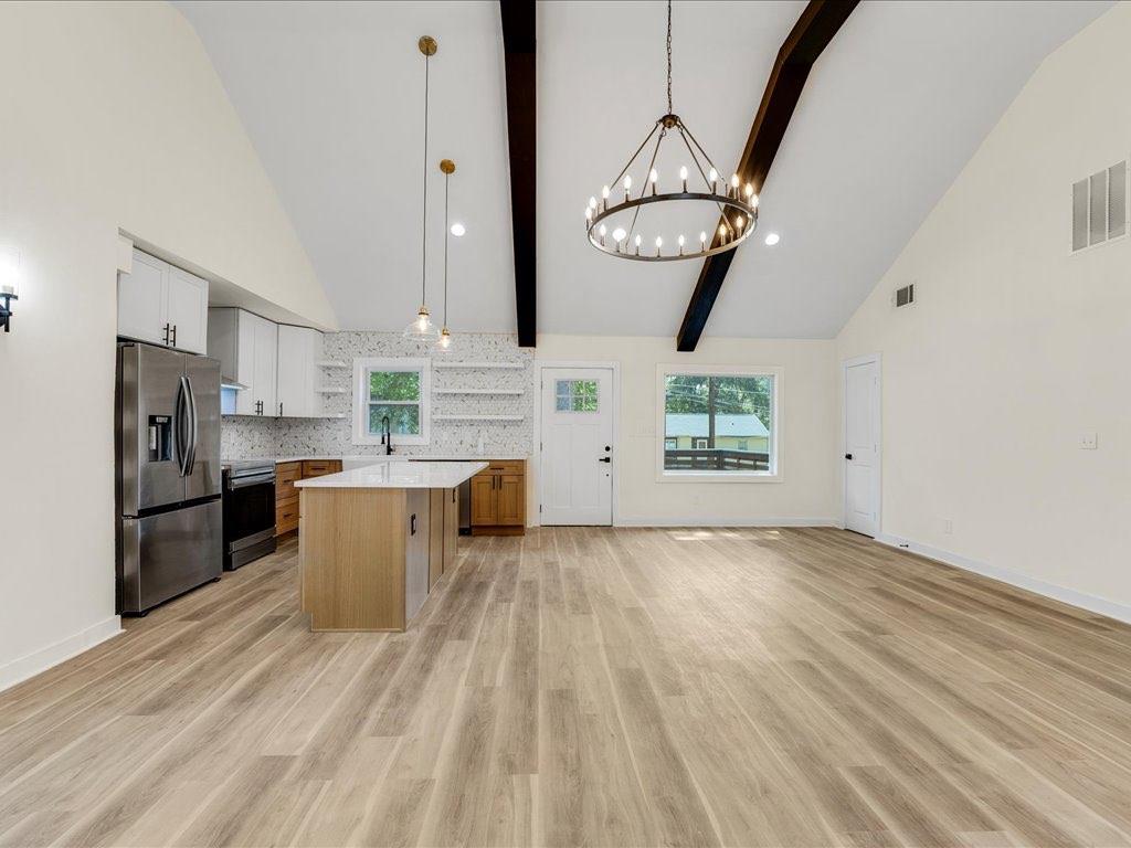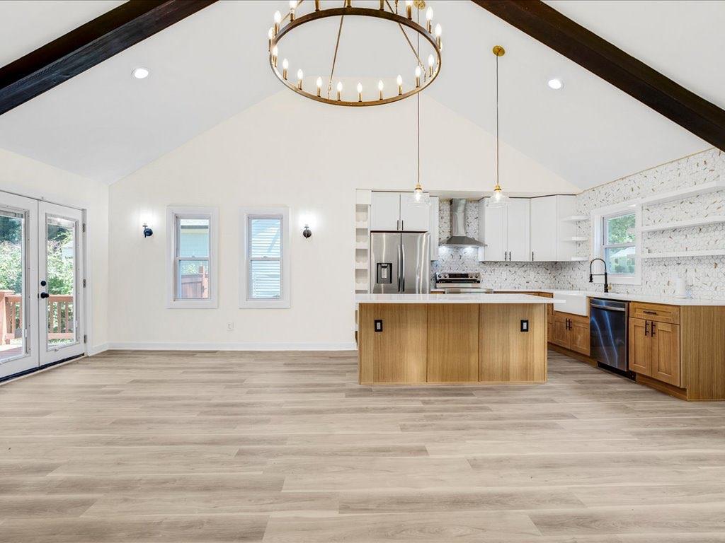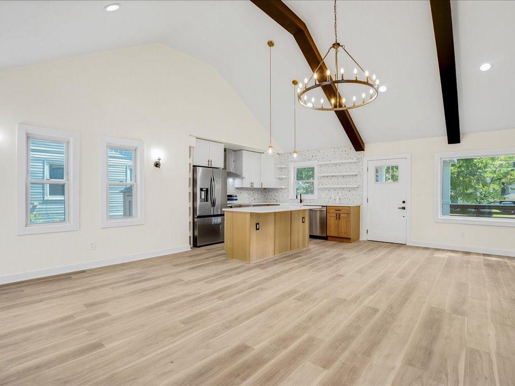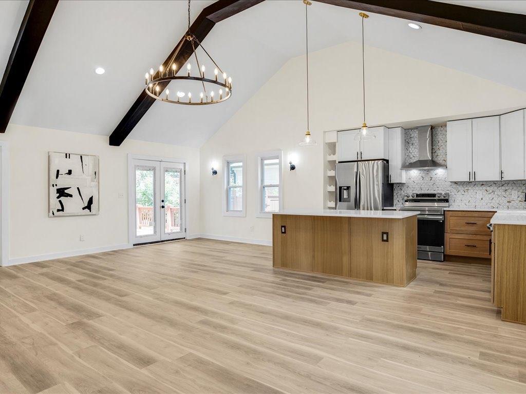 Home qualifies for 100% financing and up to 25k in forgivable grant money. This beautifully renovated and fully permitted 3-bedroom, 2-bath ranch offers over 1,500 square feet of thoughtfully designed living space. From the moment you step onto the inviting front porch, you'll be captivated by the home's charm and modern elegance. Step inside to soaring ceilings accented by striking matte black beams, complemented by an abundance of natural light and custom lighting throughout. The open-concept floor plan features sustainable waterproof LVP flooring that flows seamlessly from room to room. The custom-built kitchen is a true showstopper-featuring sleek quartz countertops, stainless steel appliances, floating shelves, and a built-in wine rack-perfect for entertaining or everyday living. Retreat to the spacious primary suite, which overlooks a large back deck and fully fenced, level backyard ideal for gatherings or relaxing evenings. The luxurious en-suite bath includes dual vanities, a deep soaking tub, and a stunning custom-tiled shower, all leading to a dreamy walk-in closet. Every detail has been carefully curated to blend modern finishes with functional comfort. Don't miss the opportunity to own this turn-key gem-schedule your showing today!