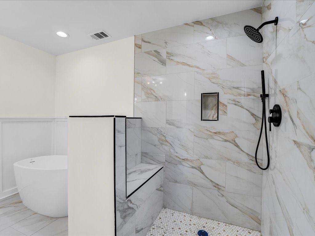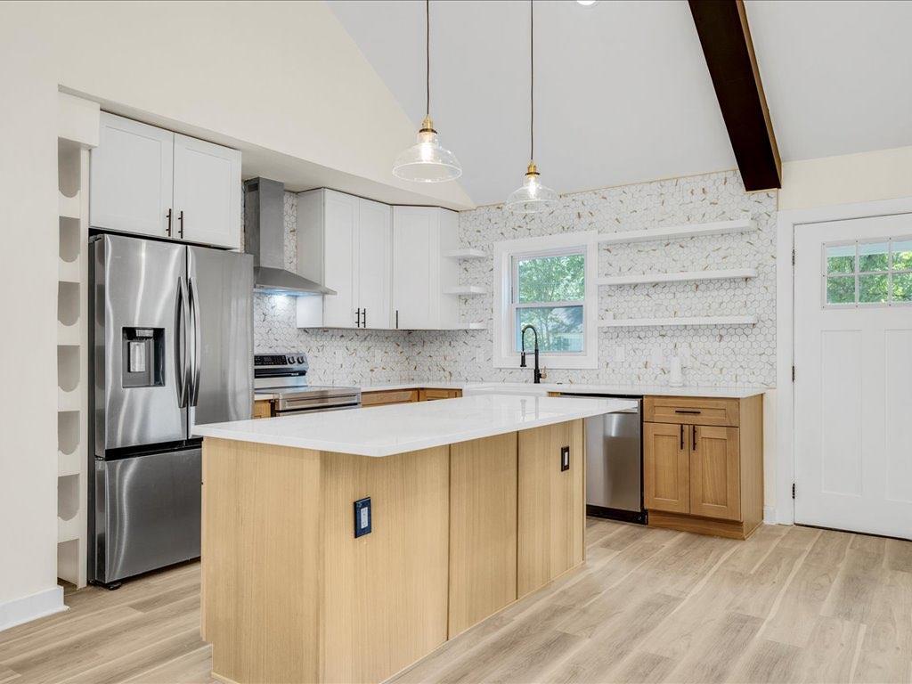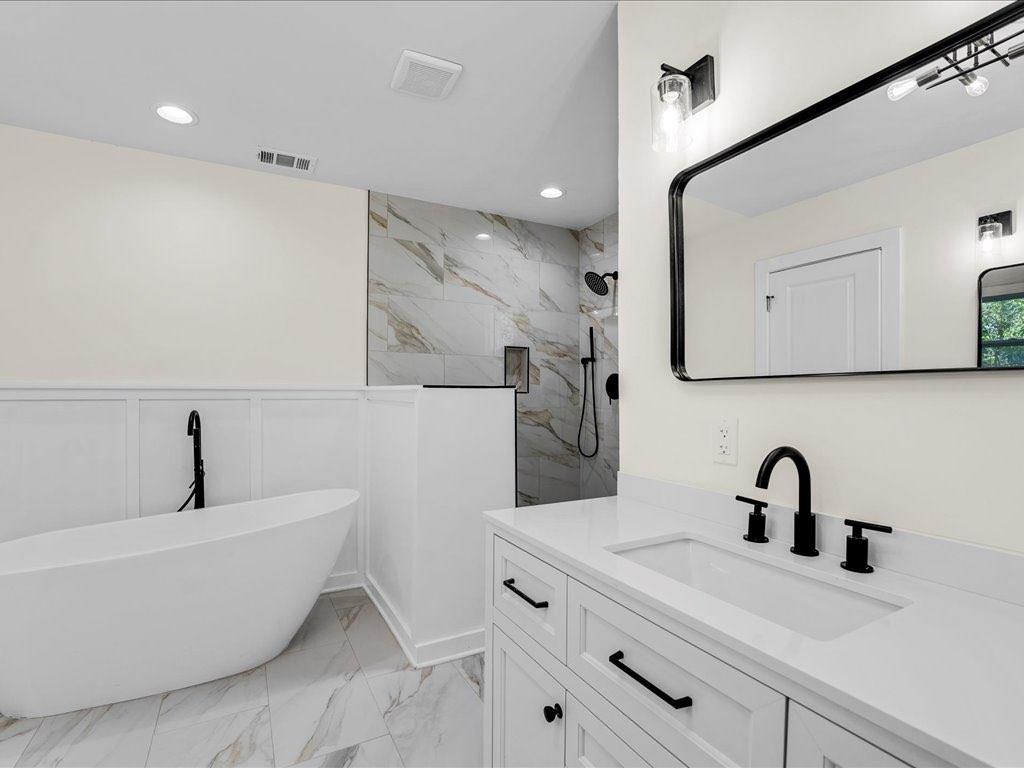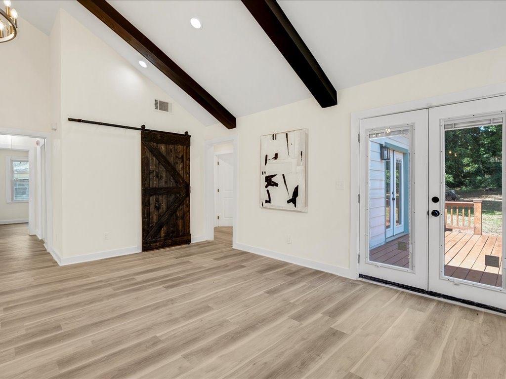 Home qualifies for 100% financing and up to 25k in forgivable grant money. This beautifully renovated and fully permitted 3-bedroom, 2-bath ranch offers over 1,500 square feet of thoughtfully designed living space. From the moment you step onto the inviting front porch, you'll be captivated by the home's charm and modern elegance. Step inside to soaring ceilings accented by striking matte black beams, complemented by an abundance of natural light and custom lighting throughout. The open-concept floor plan features sustainable waterproof LVP flooring that flows seamlessly from room to room. The custom-built kitchen is a true showstopper-featuring sleek quartz countertops, stainless steel appliances, floating shelves, and a built-in wine rack-perfect for entertaining or everyday living. Retreat to the spacious primary suite, which overlooks a large back deck and fully fenced, level backyard ideal for gatherings or relaxing evenings. The luxurious en-suite bath includes dual vanities, a deep soaking tub, and a stunning custom-tiled shower, all leading to a dreamy walk-in closet. Every detail has been carefully curated to blend modern finishes with functional comfort. Don't miss the opportunity to own this turn-key gem-schedule your showing today!