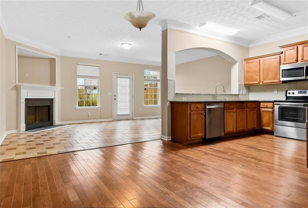 Welcome to this inviting 3-bedroom, 2.5-bath townhome featuring a spacious kitchen with stainless steel appliances, a walk-in pantry, and a clear view into the cozy family room. The open-concept layout includes a combined family and dining area centered around a warm fireplace—perfect for relaxing or entertaining guests. Upstairs, the large primary suite offers an ensuite bathroom and generous closet space. Two additional bedrooms, a full bath, and a convenient laundry room with washer and dryer complete the upper level. This home combines comfort, style, and functionality—ideal for modern living!