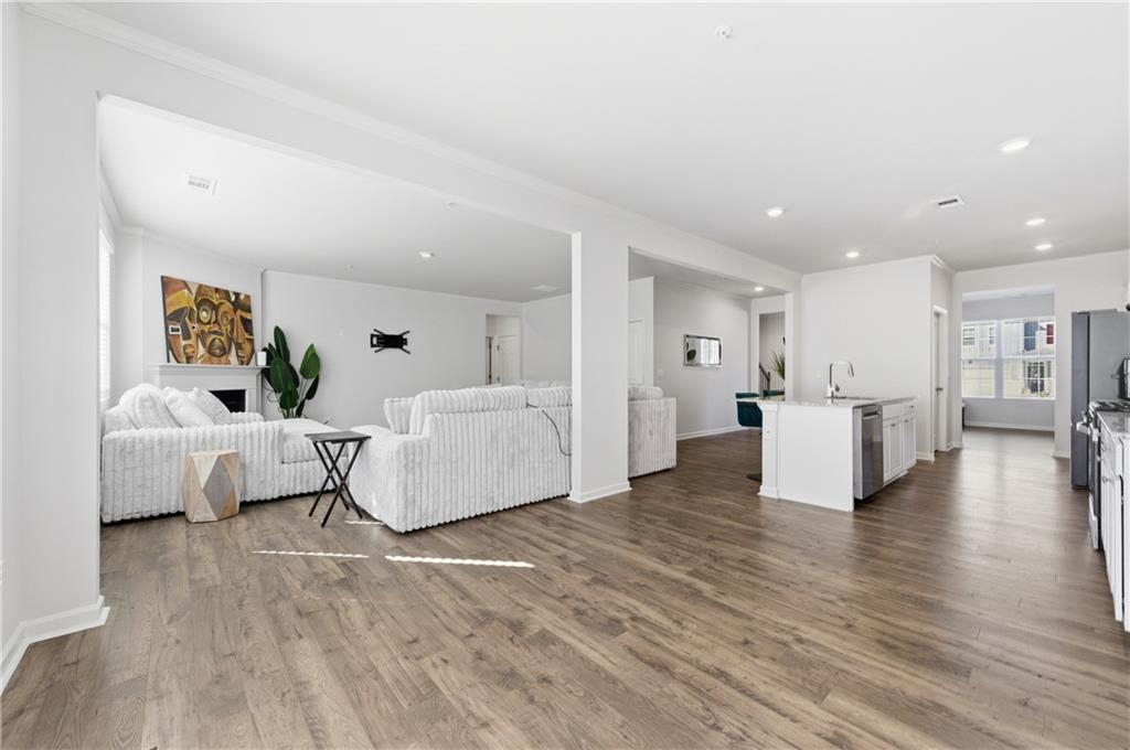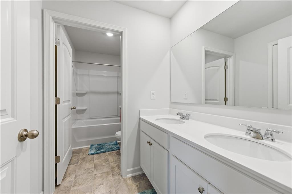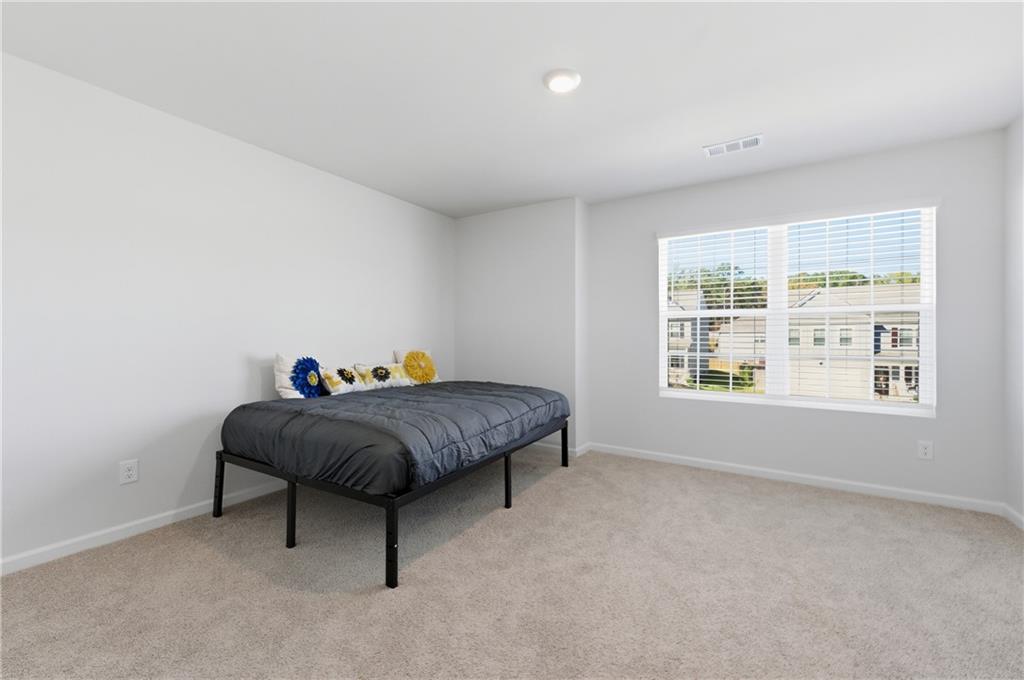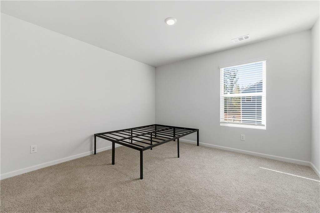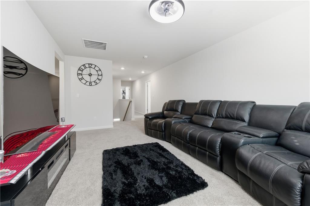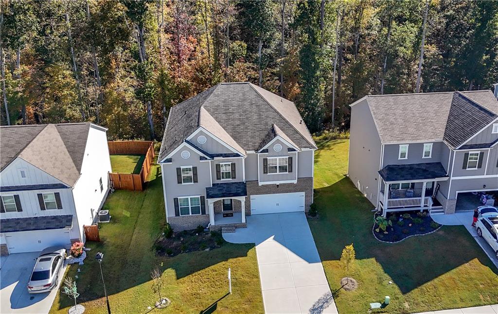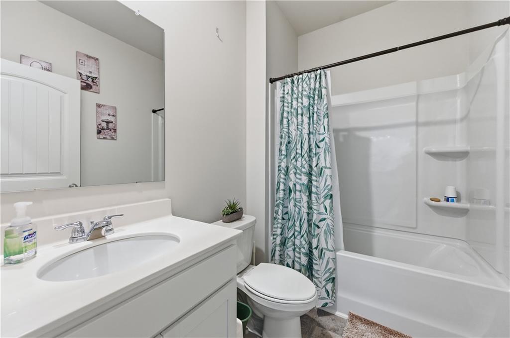 Welcome to this beautiful Halton floorplan in the sought after Oakhurst Glen community. This beautiful DR Horton 2-story resale home on a full basement, perfectly designed for modern living with stylish finishes and thoughtful upgrades throughout! The open floor plan features a spacious family room with a cozy fireplace, flowing seamlessly into the large eat-in kitchen. Enjoy cooking and entertaining with granite countertops, gray cabinetry, a tiled backsplash, center island, walk-in pantry, and a designated coffee bar or flex living area. All stainless steel appliances remain. Main-level highlights include engineered hardwood floors, a guest bedroom, and a full bath—ideal for guests or multigenerational living. Upstairs, a loft offers great flex space for a home office, media room, or play area. The oversized primary suite is a true retreat with a sitting area, dual walk-in closets, and a spa-like bath featuring granite countertops, gray cabinetry, dual sinks, a separate soaking tub, tiled shower, and tile floors. Three oversized secondary bedrooms share a hall bath with dual vanities, white cabinetry, a separate toilet/shower area, and a cultured marble countertop. A large walk-in laundry room and a deep linen closet add convenience and storage. Enjoy outdoor living on the back deck overlooking a private backyard with peaceful views of the creek area. The unfinished basement offers a blank canvas to complete your dream space and customize your landscaping. Additional features include iron stair spindles, recessed lighting, and a two-car garage on the main level. Barely over a year old, this home feels like new and is located in a community with fantastic amenities!