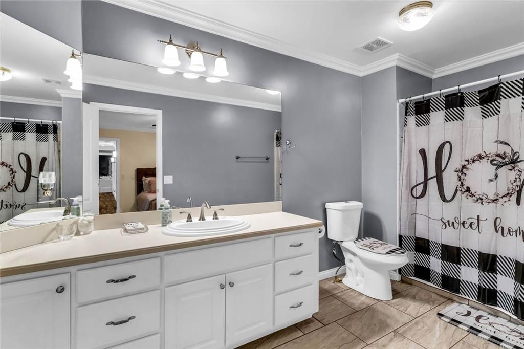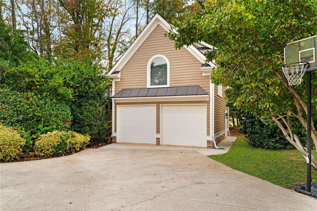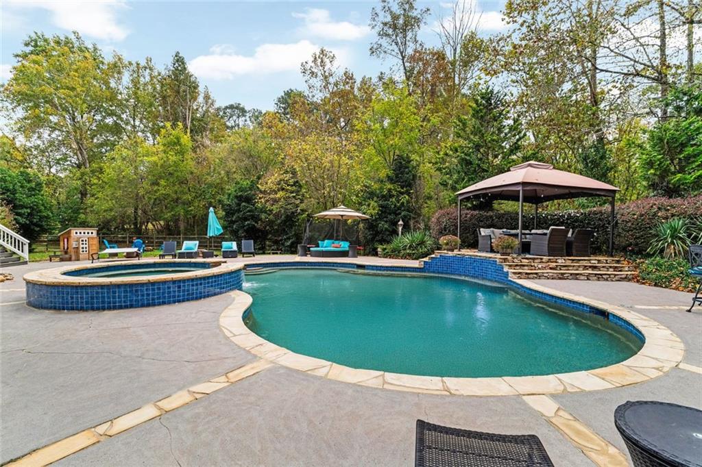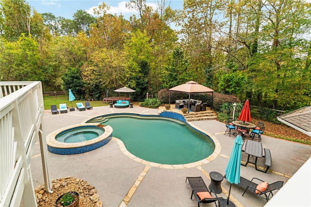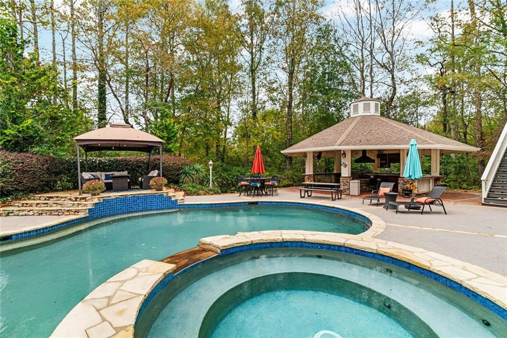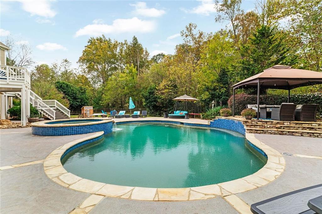 Discover Bradshaw Farms best keep secret in this amazing Estate Style nestled on 1.49 acres at the end of a private cul-de-sac and backs to your own private oasis surrounded by golf course on Red Course #1 green and Red #2 fairway. PRICED under current appraisal! Don't wait call today. This is not just a house, this is a home. This is Southern living at its finest in this grand style home with a true wrap around front porch. You will fall in love with this home from the moment you enter the spectacular custom double doors that opens to the welcoming two story foyer, curved staircase and warm, inviting hardwood flooring that flows through most main living areas. This home embodies timeless elegance and modern comfort, all in a setting worthy of lingering good nights and sunlit mornings. Home features three full kitchens, a full finished basement, in-ground pool and storage galore. The private carriage house apartment adds charm and includes a two car garage. Beautiful formal living room with fireplace, leads to gorgeous oversized formal dining room. The coffered-ceiling family room with a stacked-stone fireplace, built-in shelving, and full-height windows that overlook your private oasis backyard. The updated chef’s kitchen features quartz countertops, a six-burner gas range with custom vent hood, subway tile backsplash, a large center island, stainless steel appliances, walk-in pantry, and a butler’s pantry. Just off the kitchen is the light bright breakfast nook with shiplap walls, wraparound windows, and a double tray ceiling with coffered detailing, a perfect place to start the day. The main-level primary suite is a private luxurious retreat. A double tray ceiling crowns the spacious bedroom that includes a sitting room or office, private access to the back deck, and a spa-inspired en suite bathroom with dual vanities, a jetted soaking tub, a walk-in tiled shower with dual shower heads, oversized walk-in closet with direct access to the laundry room. The beautiful winding staircase leads to the upstairs that offers three large bedrooms and two full baths, The finished lower level is a full living space of its own, complete with two flex rooms currently used as bedrooms, a full bath, a second kitchen, a game room, a theater room, and a cozy third fireplace. This level opens out to the backyard and covered patio. Outside you’ll find a dream backyard that reaches new heights and built with no detail overlooked for outdoor living and enjoyment for every season, fully fenced and professionally landscaped. A gunite in-ground pool includes a full outdoor kitchen, firepit, and gazebo with a centerpiece fireplace, creating the ultimate space to gather or unwind. The detached carriage house offers even more, a full kitchen, living area/bedroom, laundry and bathroom, ideal for guests, extended stays, or extra income potential. This estate combines superb architectural details, lush grounds and the tranquility to let you enjoy all this home has to offer. Bradshaw Farm amenities can't be beat, You will enjoy access to multiple pools, tennis courts, pickleball, volleyball, basketball, a clubhouse, and playgrounds, with an amazing Golf course, all in one of Woodstock’s most desirable neighborhoods.