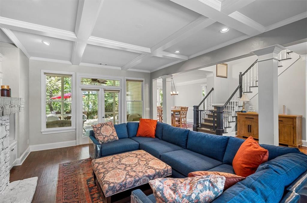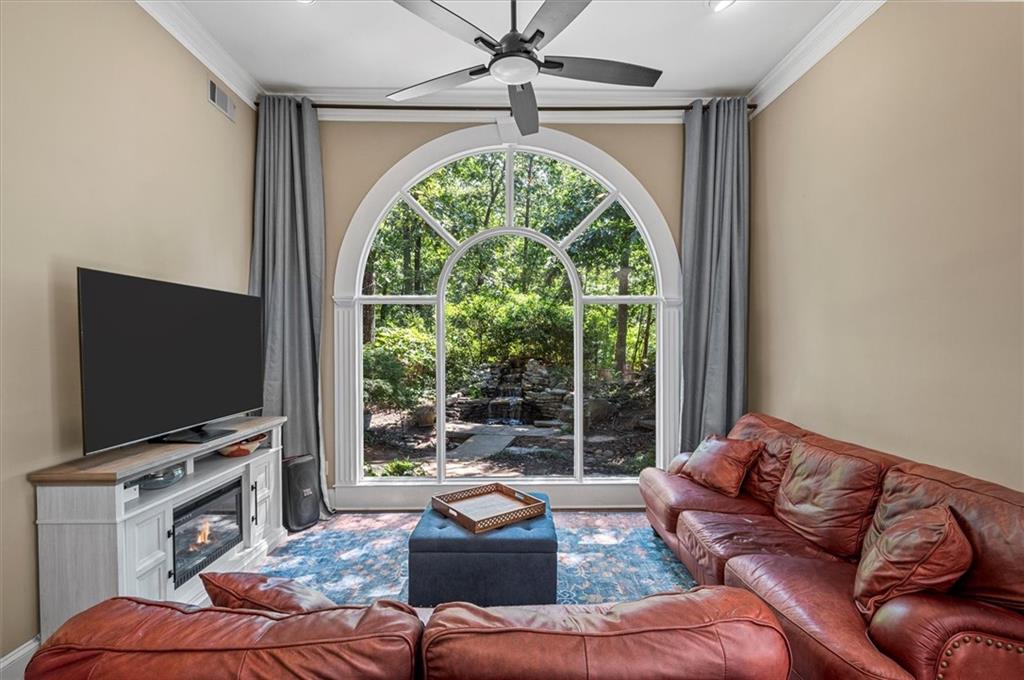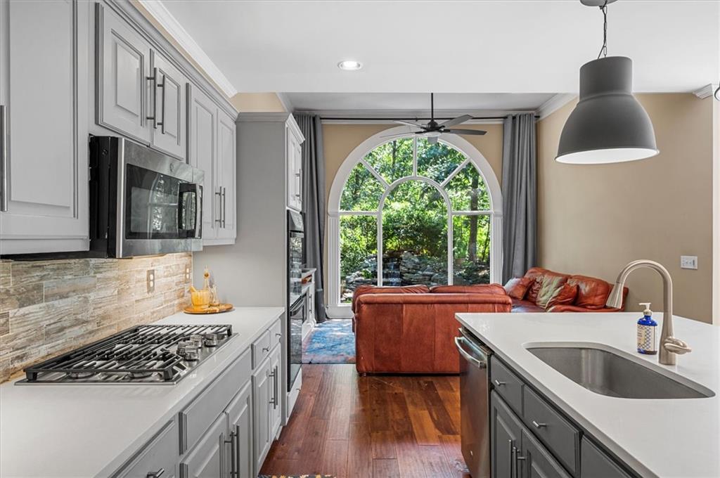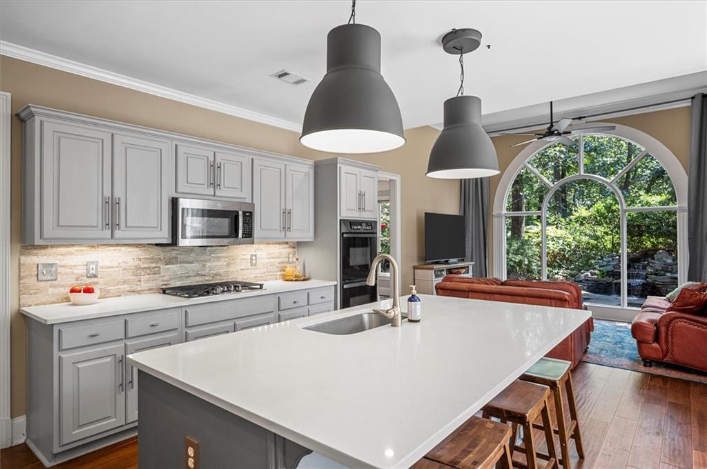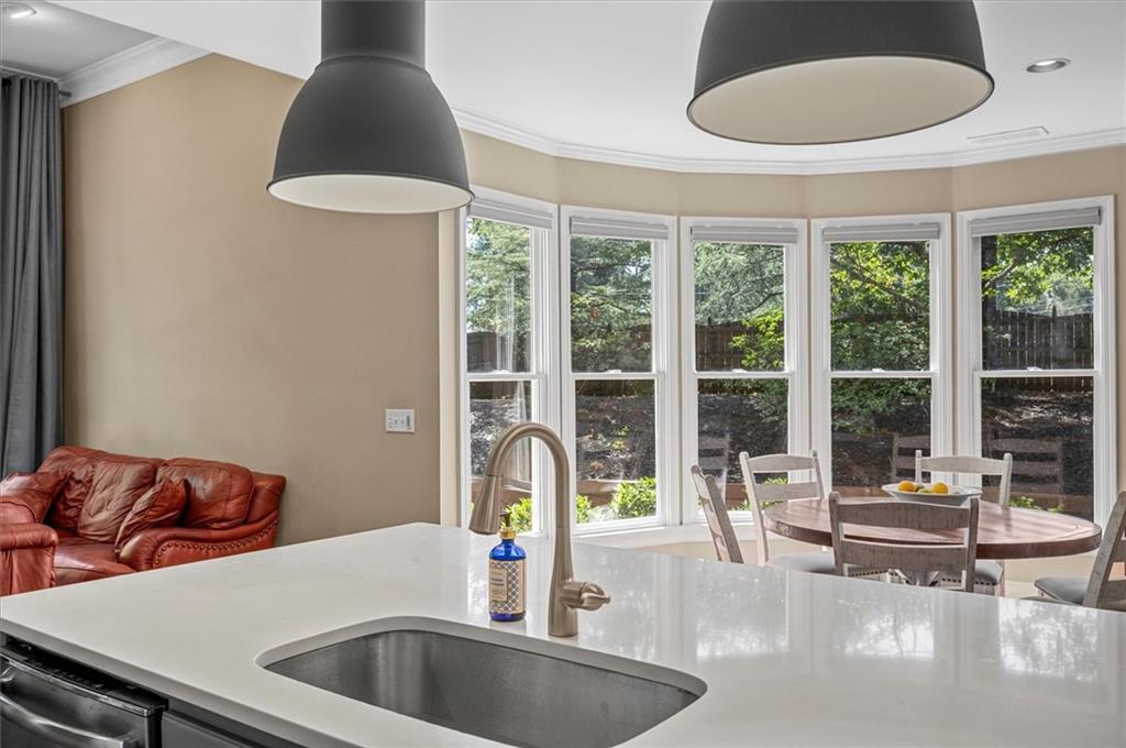 Nestled on a serene cul-de-sac in the sought-after Spalding Heights neighborhood, this beautifully renovated home sits on a lush, private 0.8-acre lot that feels like a tranquil retreat! Upon entering, you're greeted by soaring high ceilings and gleaming wide-plank hardwood floors. Fresh paint and modern lighting add a crisp, inviting ambiance throughout. The heart of the home, the kitchen, includes a spacious island, breakfast bar, pantry, and a sunny breakfast nook adjacent to a cozy keeping room—perfect for casual gatherings or morning coffee. The two-story foyer leads into a grand great room with a coffered ceiling, where large windows offer scenic views and abundant natural light. Step through sliding doors to the screened porch and flagstone patio—ideal for entertaining or quiet relaxation. A charming terraced waterfall flows into a koi pond, adding a touch of serenity to the backyard oasis. A versatile bedroom/office with an adjacent full bath on the main level offers both flexibility & comfort-perfect for guests! Upstairs, the Primary Suite is a private sanctuary, featuring a tray ceiling, sitting area, spa-like bath with dual quartz vanities, a soaking tub, roomy shower, and an expansive walk-in closet. Three additional bedrooms and two upgraded baths complete the upper level. Outside, the fully fenced backyard features a Japanese garden, mature landscaping, and a generous level area perfect for a fire pit, play set, or simply enjoying time outdoors. This home’s prime Sandy Springs location offers both tranquility and convenience. It’s just minutes from Dunwoody Country Club and nearby shopping and dining options, providing the perfect blend of suburban peace and city-side amenities. This gem offers an exceptional opportunity to own a captivating and thoughtfully updated residence that perfectly balances indoor elegance with outdoor charm. Ideal for entertainers or anyone seeking a serene sanctuary with modern comforts and effortless access to the best of Sandy Springs!