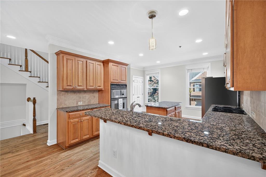 - KitchenCabinets Stain, Kitchen Island, Pantry, Stone Counters, View to Family Room