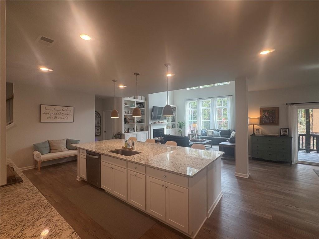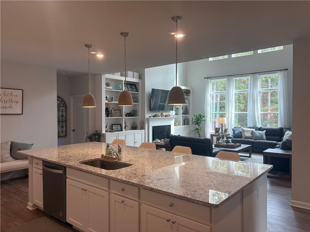 - KitchenCabinets White, Kitchen Island, Pantry Walk-In, Stone Counters, View to Family Room
