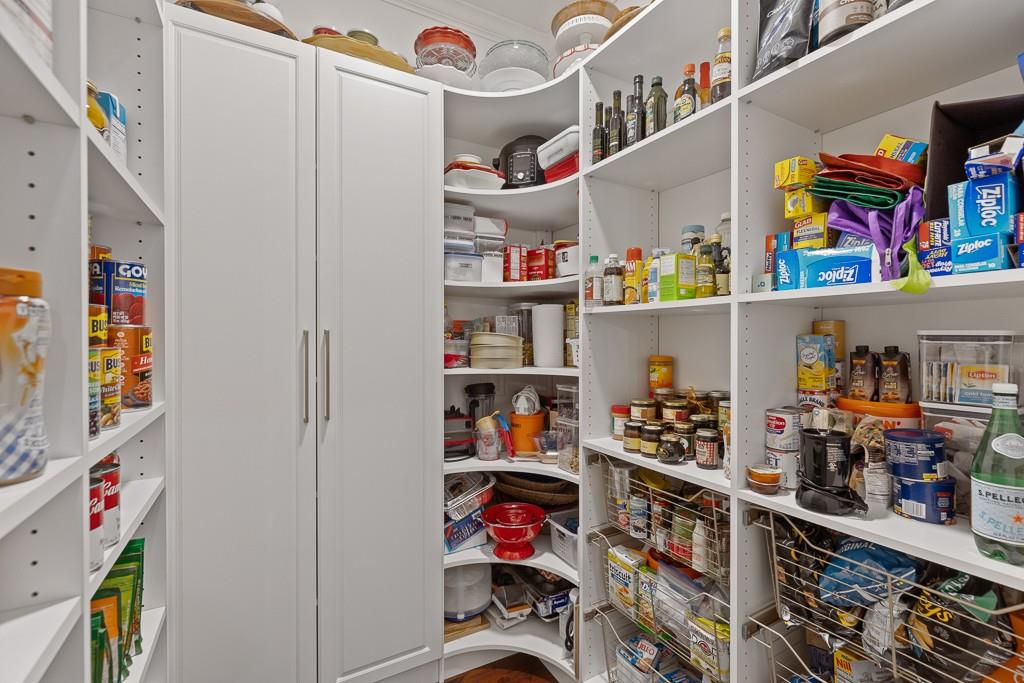 - KitchenCabinets White, Kitchen Island, Pantry Walk-In, Solid Surface Counters, View to Family Room