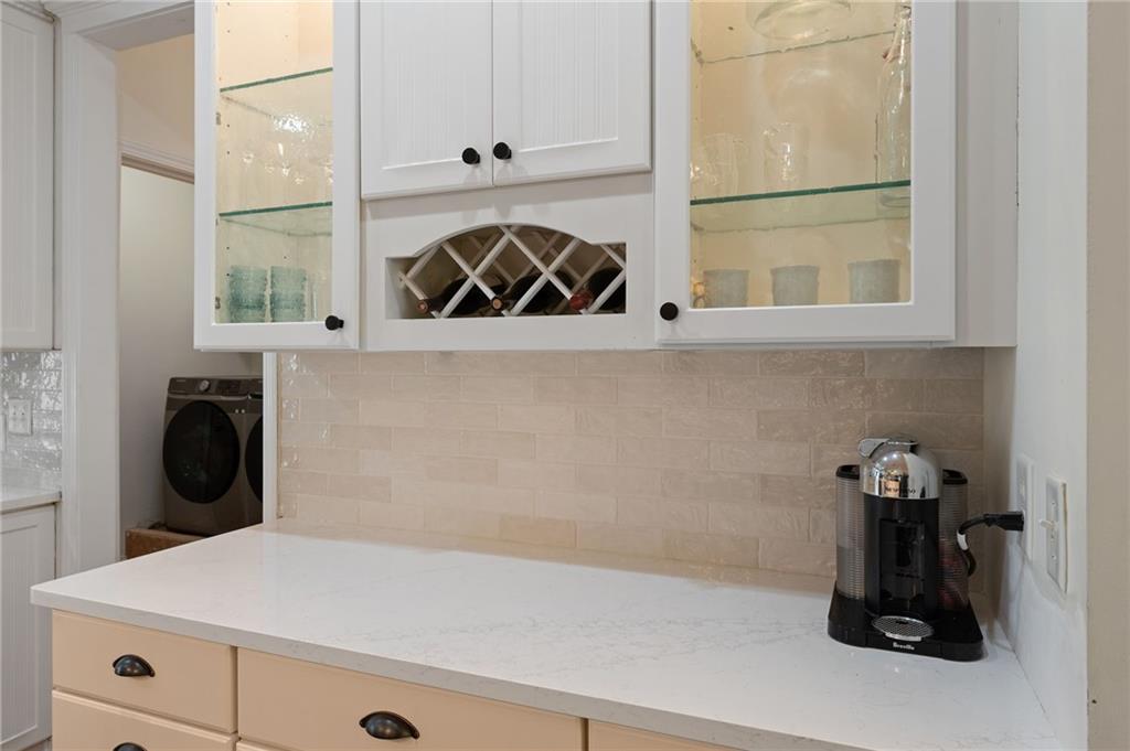 - KitchenBreakfast Room, Cabinets White, Eat-in Kitchen, Kitchen Island, Pantry Walk-In, Stone Counters, View to Family Room, Wine Rack