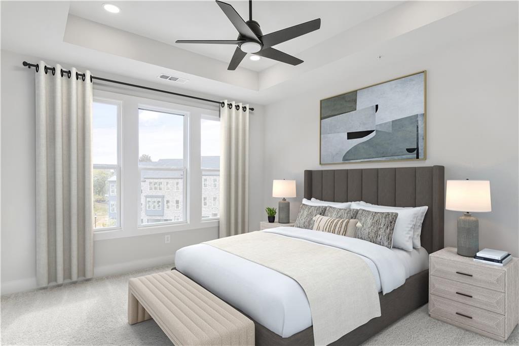 Lot 90 is MOVE-IN Ready! Come see award-winning Toll Brothers' Newest Community in Smyrna, ROWAN WALK. We are less than 1 mile to the Battery, Braves Stadium/Truist Park, Cumberland Mall, I-285, & I-75. Location is A+. Neighborhood includes Resort Style Pool Amenities. The Henry floorplan is a 3 bedroom, 3.5 bathroom townhome that includes a bedroom on the ground level. This home is designed with clean lines, natural light-filled rooms, designer interior finishes, 10' ceilings on Main Level. The main level features a gorgeous kitchen that is great for entertaining! Includes a huge island, built-in Stainless Steel Appliances. Large, Oversized Deck extends over the driveway. Spacious bedrooms, huge closets and designer baths are just a few of the additional details! Current incentives include up to $10,000 in seller paid closing costs with use of preferred lender. There is NO Rental Cap in the community. Photos are of model home and are a similar floorplan in the community.