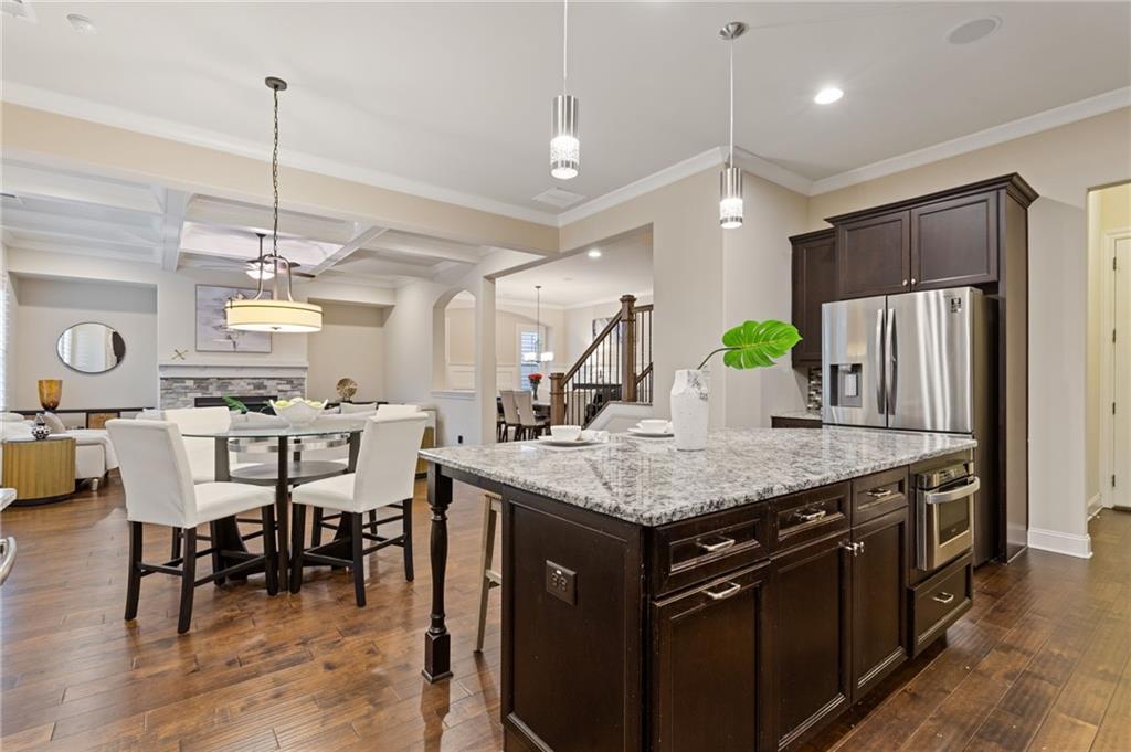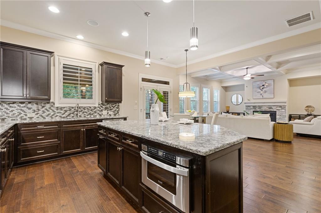 - KitchenCabinets Stain, Eat-in Kitchen, Kitchen Island, Pantry, Pantry Walk-In, Stone Counters, View to Family Room