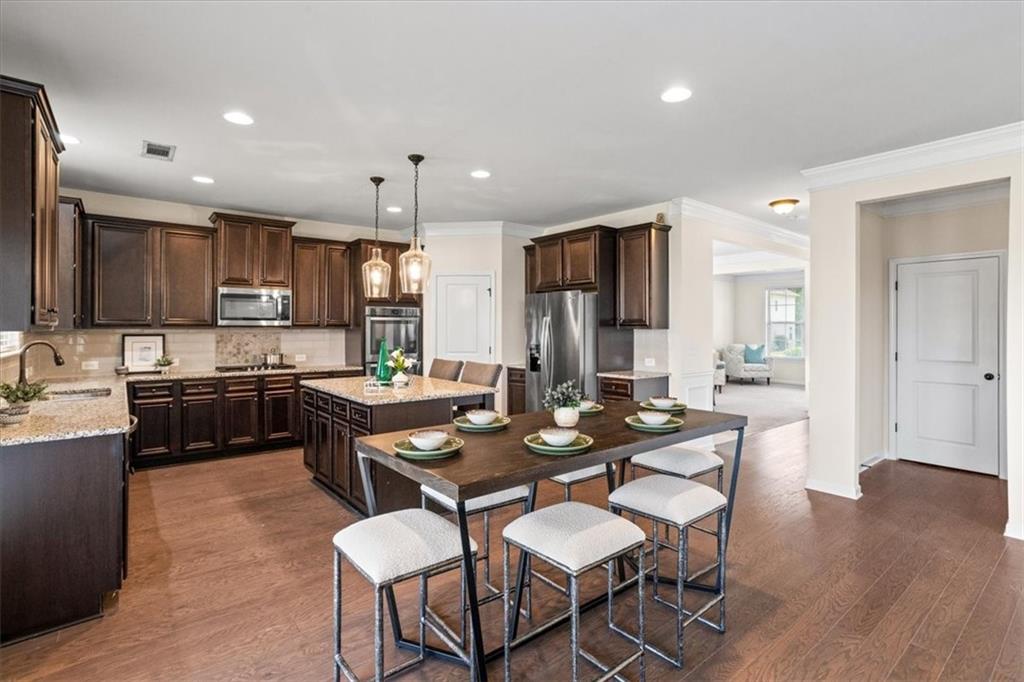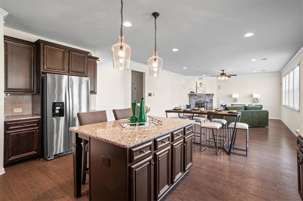 - KitchenBreakfast Bar, Cabinets Stain, Eat-in Kitchen, Kitchen Island, Pantry Walk-In, Stone Counters, View to Family Room